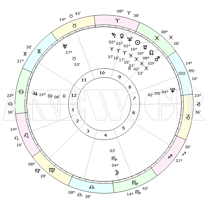 | | ΘΕΣΕΙΣ ΠΛΑΝΗΤΩΝ ΑΣΤΡΟΛΟΓΙΚΟΥ ΧΑΡΤΗ ΤΗΣ ΣΤΙΓΜΗΣ ΑΥΤΗΣ | | | | Πλανήτης | Ζώδιο | Μοίρες | Δεκαήμ. | Σε οίκο | Απόκλιση | | Ακμές των οίκων | | Ηλιος | Ιχθείς | 16°52' | Δεύτερο | 10 | 05 S 11 | | 1ος | 05°17' | Καρκίνος | | Σελήνη | Σκορπιός | 03°20' | Πρώτο | 5 | 16 S 39 | | 2ος | 25°50' | Καρκίνος | | Ερμής | Ιχθείς | 16°54'R | Δεύτερο | 10 | 01 S 49 | | 3ος | 18°01' | Λέων | | Αφροδίτη | Κριός | 01°15' | Πρώτο | 10 | 00 S 39 | | 4ος | 15°12' | Παρθένος | | Αρης | Ιχθείς | 03°50' | Πρώτο | 9 | 11 S 07 | | 5ος | 19°55' | Ζυγός | | Δίας | Καρκίνος | 15°06'R | Δεύτερο | 1 | 22 N 56 | | 6ος | 29°26' | Σκορπιός | | Κρόνος | Κριός | 02°37' | Πρώτο | 10 | 00 S 55 | | 7ος | 05°17' | Αιγόκερως | | Ουρανός | Ταύρος | 27°53' | Τρίτο | 11 | 19 N 31 | | 8ος | 25°49' | Αιγόκερως | | Ποσειδώνας | Κριός | 01°17' | Πρώτο | 10 | 00 S 41 | | 9ος | 18°01' | Υδροχόος | | Πλούτωνας | Υδροχόος | 04°42' | Πρώτο | 8 | 22 S 51 | | 10ος | 15°12' | Ιχθείς | | Β. Δεσμός | Ιχθείς | 08°42' | Πρώτο | 9 | 08 S 18 | | 11ος | 19°55' | Κριός | | Ωροσκόπος | Καρκίνος | 05°17' | Πρώτο | | | 12ος | 29°26' | Ταύρος | | Μεσουράνημα | Ιχθείς | 15°12' | Δεύτερο | | | |