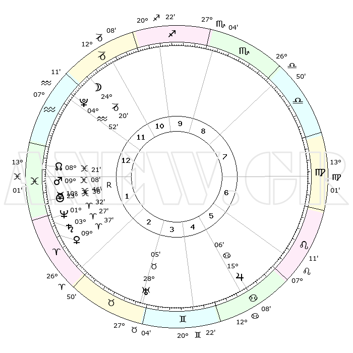 | | ΘΕΣΕΙΣ ΠΛΑΝΗΤΩΝ ΑΣΤΡΟΛΟΓΙΚΟΥ ΧΑΡΤΗ ΤΗΣ ΣΤΙΓΜΗΣ ΑΥΤΗΣ | | | | Πλανήτης | Ζώδιο | Μοίρες | Δεκαήμ. | Σε οίκο | Απόκλιση | | Ακμές των οίκων | | Ηλιος | Ιχθείς | 23°32' | Τρίτο | 1 | 02 S 34 | | 1ος | 12°17' | Υδροχόος | | Σελήνη | Αιγόκερως | 23°36' | Τρίτο | 12 | 25 S 04 | | 2ος | 27°50' | Ιχθείς | | Ερμής | Ιχθείς | 10°48'R | Δεύτερο | 1 | 05 S 05 | | 3ος | 04°05' | Ταύρος | | Αφροδίτη | Κριός | 09°33' | Πρώτο | 2 | 02 N 48 | | 4ος | 00°37' | Δίδυμοι | | Αρης | Ιχθείς | 09°05' | Πρώτο | 1 | 09 S 10 | | 5ος | 22°41' | Δίδυμοι | | Δίας | Καρκίνος | 15°06' | Δεύτερο | 6 | 22 N 56 | | 6ος | 14°44' | Καρκίνος | | Κρόνος | Κριός | 03°26' | Πρώτο | 2 | 00 S 35 | | 7ος | 12°17' | Λέων | | Ουρανός | Ταύρος | 28°05' | Τρίτο | 3 | 19 N 33 | | 8ος | 27°50' | Παρθένος | | Ποσειδώνας | Κριός | 01°32' | Πρώτο | 2 | 00 S 35 | | 9ος | 04°05' | Σκορπιός | | Πλούτωνας | Υδροχόος | 04°52' | Πρώτο | 12 | 22 S 50 | | 10ος | 00°37' | Τοξότης | | Β. Δεσμός | Ιχθείς | 08°21' | Πρώτο | 1 | 08 S 26 | | 11ος | 22°41' | Τοξότης | | Ωροσκόπος | Υδροχόος | 12°17' | Δεύτερο | | | 12ος | 14°44' | Αιγόκερως | | Μεσουράνημα | Τοξότης | 00°37' | Πρώτο | | | |