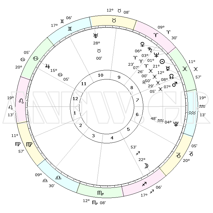 | | ΘΕΣΕΙΣ ΠΛΑΝΗΤΩΝ ΑΣΤΡΟΛΟΓΙΚΟΥ ΧΑΡΤΗ ΤΗΣ ΣΤΙΓΜΗΣ ΑΥΤΗΣ | | | | Πλανήτης | Ζώδιο | Μοίρες | Δεκαήμ. | Σε οίκο | Απόκλιση | | Ακμές των οίκων | | Ηλιος | Ιχθείς | 20°56' | Τρίτο | 9 | 03 S 35 | | 1ος | 00°54' | Λέων | | Σελήνη | Τοξότης | 22°08' | Τρίτο | 5 | 28 S 20 | | 2ος | 21°60' | Λέων | | Ερμής | Ιχθείς | 12°54'R | Δεύτερο | 8 | 03 S 49 | | 3ος | 17°10' | Παρθένος | | Αφροδίτη | Κριός | 06°18' | Πρώτο | 9 | 01 N 27 | | 4ος | 18°18' | Ζυγός | | Αρης | Ιχθείς | 07°02' | Πρώτο | 8 | 09 S 56 | | 5ος | 24°20' | Σκορπιός | | Δίας | Καρκίνος | 15°05' | Δεύτερο | 12 | 22 N 56 | | 6ος | 29°53' | Τοξότης | | Κρόνος | Κριός | 03°07' | Πρώτο | 9 | 00 S 43 | | 7ος | 00°54' | Υδροχόος | | Ουρανός | Ταύρος | 28°00' | Τρίτο | 11 | 19 N 32 | | 8ος | 21°60' | Υδροχόος | | Ποσειδώνας | Κριός | 01°26' | Πρώτο | 9 | 00 S 38 | | 9ος | 17°10' | Ιχθείς | | Πλούτωνας | Υδροχόος | 04°48' | Πρώτο | 7 | 22 S 50 | | 10ος | 18°18' | Κριός | | Β. Δεσμός | Ιχθείς | 08°29' | Πρώτο | 8 | 08 S 23 | | 11ος | 24°20' | Ταύρος | | Ωροσκόπος | Λέων | 00°54' | Πρώτο | | | 12ος | 29°53' | Δίδυμοι | | Μεσουράνημα | Κριός | 18°18' | Δεύτερο | | | |
