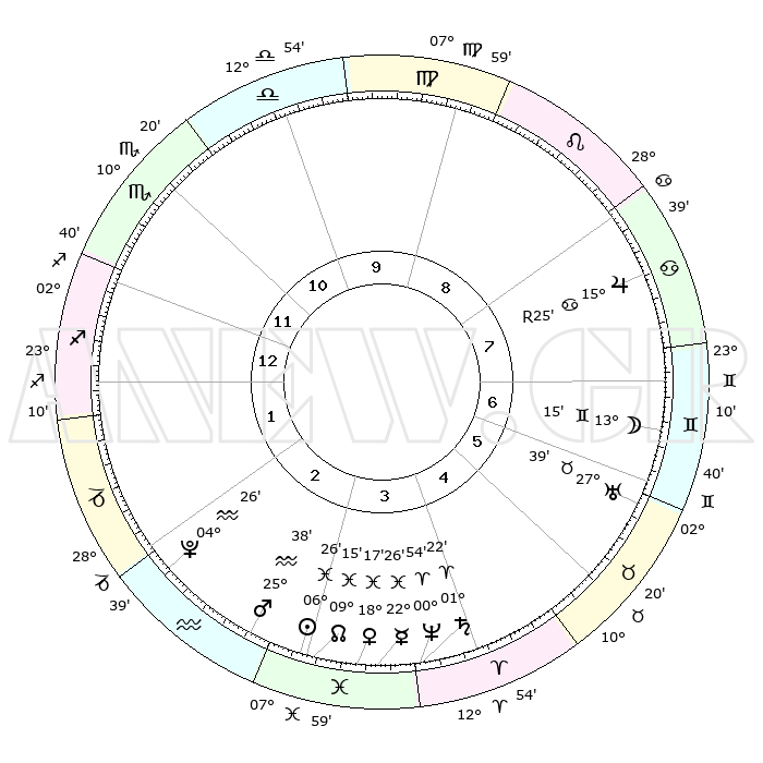 | | ΘΕΣΕΙΣ ΠΛΑΝΗΤΩΝ ΑΣΤΡΟΛΟΓΙΚΟΥ ΧΑΡΤΗ ΤΗΣ ΣΤΙΓΜΗΣ ΑΥΤΗΣ | | | | Πλανήτης | Ζώδιο | Μοίρες | Δεκαήμ. | Σε οίκο | Απόκλιση | | Ακμές των οίκων | | Ηλιος | Ιχθείς | 06°22' | Πρώτο | 3 | 09 S 10 | | 1ος | 04°58' | Τοξότης | | Σελήνη | Δίδυμοι | 12°24' | Δεύτερο | 7 | 27 N 30 | | 2ος | 06°49' | Αιγόκερως | | Ερμής | Ιχθείς | 22°25' | Τρίτο | 4 | 00 S 43 | | 3ος | 13°22' | Υδροχόος | | Αφροδίτη | Ιχθείς | 18°12' | Δεύτερο | 3 | 05 S 58 | | 4ος | 19°27' | Ιχθείς | | Αρης | Υδροχόος | 25°35' | Τρίτο | 3 | 14 S 01 | | 5ος | 19°50' | Κριός | | Δίας | Καρκίνος | 15°25'R | Δεύτερο | 8 | 22 N 53 | | 6ος | 14°13' | Ταύρος | | Κρόνος | Κριός | 01°22' | Πρώτο | 4 | 01 S 25 | | 7ος | 04°58' | Δίδυμοι | | Ουρανός | Ταύρος | 27°39' | Τρίτο | 6 | 19 N 27 | | 8ος | 06°50' | Καρκίνος | | Ποσειδώνας | Κριός | 00°54' | Πρώτο | 4 | 00 S 50 | | 9ος | 13°22' | Λέων | | Πλούτωνας | Υδροχόος | 04°26' | Πρώτο | 2 | 22 S 54 | | 10ος | 19°27' | Παρθένος | | Β. Δεσμός | Ιχθείς | 09°15' | Πρώτο | 3 | 08 S 06 | | 11ος | 19°50' | Ζυγός | | Ωροσκόπος | Τοξότης | 04°58' | Πρώτο | | | 12ος | 14°13' | Σκορπιός | | Μεσουράνημα | Παρθένος | 19°27' | Δεύτερο | | | |