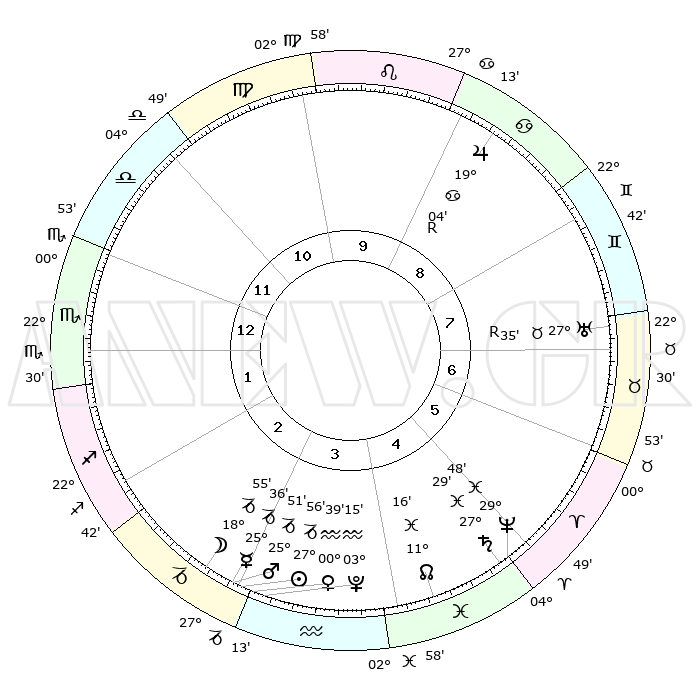 | | ΘΕΣΕΙΣ ΠΛΑΝΗΤΩΝ ΑΣΤΡΟΛΟΓΙΚΟΥ ΧΑΡΤΗ ΤΗΣ ΣΤΙΓΜΗΣ ΑΥΤΗΣ | | | | Πλανήτης | Ζώδιο | Μοίρες | Δεκαήμ. | Σε οίκο | Απόκλιση | | Ακμές των οίκων | | Ηλιος | Αιγόκερως | 27°52' | Τρίτο | 3 | 20 S 35 | | 1ος | 02°59' | Σκορπιός | | Σελήνη | Αιγόκερως | 18°05' | Δεύτερο | 3 | 26 S 12 | | 2ος | 01°35' | Τοξότης | | Ερμής | Αιγόκερως | 25°30' | Τρίτο | 3 | 22 S 56 | | 3ος | 03°47' | Αιγόκερως | | Αφροδίτη | Υδροχόος | 00°34' | Πρώτο | 3 | 21 S 04 | | 4ος | 08°11' | Υδροχόος | | Αρης | Αιγόκερως | 25°48' | Τρίτο | 3 | 21 S 57 | | 5ος | 11°03' | Ιχθείς | | Δίας | Καρκίνος | 19°05'R | Δεύτερο | 9 | 22 N 21 | | 6ος | 09°27' | Κριός | | Κρόνος | Ιχθείς | 27°29' | Τρίτο | 5 | 03 S 02 | | 7ος | 02°59' | Ταύρος | | Ουρανός | Ταύρος | 27°35'R | Τρίτο | 7 | 19 N 26 | | 8ος | 01°35' | Δίδυμοι | | Ποσειδώνας | Ιχθείς | 29°48' | Τρίτο | 5 | 01 S 18 | | 9ος | 03°47' | Καρκίνος | | Πλούτωνας | Υδροχόος | 03°15' | Πρώτο | 3 | 23 S 07 | | 10ος | 08°11' | Λέων | | Β. Δεσμός | Ιχθείς | 11°16' | Δεύτερο | 5 | 07 S 20 | | 11ος | 11°03' | Παρθένος | | Ωροσκόπος | Σκορπιός | 02°59' | Πρώτο | | | 12ος | 09°27' | Ζυγός | | Μεσουράνημα | Λέων | 08°11' | Πρώτο | | | |