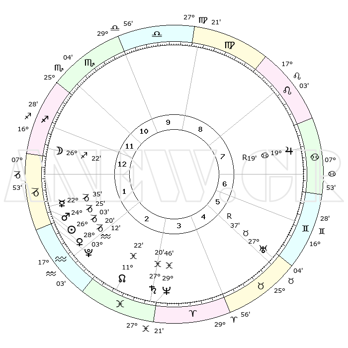 | | ΘΕΣΕΙΣ ΠΛΑΝΗΤΩΝ ΑΣΤΡΟΛΟΓΙΚΟΥ ΧΑΡΤΗ ΤΗΣ ΣΤΙΓΜΗΣ ΑΥΤΗΣ | | | | Πλανήτης | Ζώδιο | Μοίρες | Δεκαήμ. | Σε οίκο | Απόκλιση | | Ακμές των οίκων | | Ηλιος | Αιγόκερως | 25°59' | Τρίτο | 2 | 20 S 57 | | 1ος | 15°19' | Τοξότης | | Σελήνη | Τοξότης | 25°31' | Τρίτο | 1 | 28 S 18 | | 2ος | 19°04' | Αιγόκερως | | Ερμής | Αιγόκερως | 22°28' | Τρίτο | 2 | 23 S 23 | | 3ος | 27°20' | Υδροχόος | | Αφροδίτη | Αιγόκερως | 28°14' | Τρίτο | 2 | 21 S 30 | | 4ος | 03°01' | Κριός | | Αρης | Αιγόκερως | 24°22' | Τρίτο | 2 | 22 S 12 | | 5ος | 01°47' | Ταύρος | | Δίας | Καρκίνος | 19°20'R | Δεύτερο | 8 | 22 N 19 | | 6ος | 24°54' | Ταύρος | | Κρόνος | Ιχθείς | 27°20' | Τρίτο | 3 | 03 S 05 | | 7ος | 15°19' | Δίδυμοι | | Ουρανός | Ταύρος | 27°37'R | Τρίτο | 6 | 19 N 26 | | 8ος | 19°04' | Καρκίνος | | Ποσειδώνας | Ιχθείς | 29°46' | Τρίτο | 3 | 01 S 19 | | 9ος | 27°20' | Λέων | | Πλούτωνας | Υδροχόος | 03°12' | Πρώτο | 2 | 23 S 07 | | 10ος | 03°02' | Ζυγός | | Β. Δεσμός | Ιχθείς | 11°22' | Δεύτερο | 3 | 07 S 18 | | 11ος | 01°47' | Σκορπιός | | Ωροσκόπος | Τοξότης | 15°19' | Δεύτερο | | | 12ος | 24°54' | Σκορπιός | | Μεσουράνημα | Ζυγός | 03°02' | Πρώτο | | | |