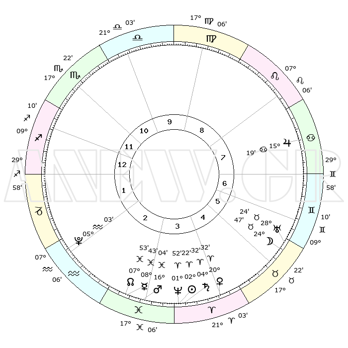 | | ΘΕΣΕΙΣ ΠΛΑΝΗΤΩΝ ΑΣΤΡΟΛΟΓΙΚΟΥ ΧΑΡΤΗ ΤΗΣ ΣΤΙΓΜΗΣ ΑΥΤΗΣ | | | | Πλανήτης | Ζώδιο | Μοίρες | Δεκαήμ. | Σε οίκο | Απόκλιση | | Ακμές των οίκων | | Ηλιος | Κριός | 02°18' | Πρώτο | 4 | 00 N 55 | | 1ος | 09°20' | Τοξότης | | Σελήνη | Ταύρος | 23°50' | Τρίτο | 6 | 23 N 37 | | 2ος | 11°57' | Αιγόκερως | | Ερμής | Ιχθείς | 08°43' | Πρώτο | 3 | 07 S 51 | | 3ος | 19°14' | Υδροχόος | | Αφροδίτη | Κριός | 20°27' | Τρίτο | 4 | 07 N 15 | | 4ος | 25°14' | Ιχθείς | | Αρης | Ιχθείς | 16°01' | Δεύτερο | 3 | 06 S 30 | | 5ος | 24°57' | Κριός | | Δίας | Καρκίνος | 15°19' | Δεύτερο | 8 | 22 N 55 | | 6ος | 18°47' | Ταύρος | | Κρόνος | Κριός | 04°32' | Πρώτο | 4 | 00 S 09 | | 7ος | 09°20' | Δίδυμοι | | Ουρανός | Ταύρος | 28°24' | Τρίτο | 6 | 19 N 38 | | 8ος | 11°57' | Καρκίνος | | Ποσειδώνας | Κριός | 01°52' | Πρώτο | 4 | 00 S 27 | | 9ος | 19°14' | Λέων | | Πλούτωνας | Υδροχόος | 05°03' | Πρώτο | 2 | 22 S 48 | | 10ος | 25°14' | Παρθένος | | Β. Δεσμός | Ιχθείς | 07°53' | Πρώτο | 3 | 08 S 37 | | 11ος | 24°57' | Ζυγός | | Ωροσκόπος | Τοξότης | 09°20' | Πρώτο | | | 12ος | 18°47' | Σκορπιός | | Μεσουράνημα | Παρθένος | 25°14' | Τρίτο | | | |