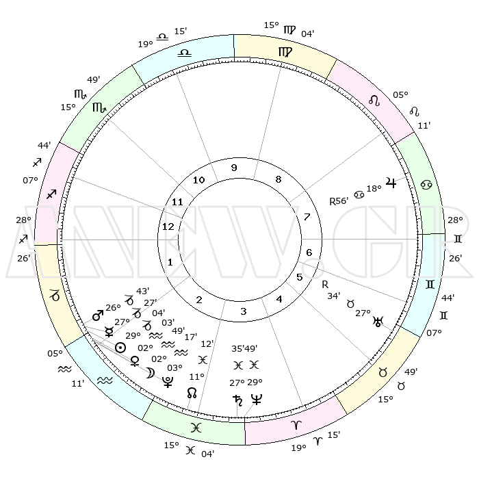 | | ΘΕΣΕΙΣ ΠΛΑΝΗΤΩΝ ΑΣΤΡΟΛΟΓΙΚΟΥ ΧΑΡΤΗ ΤΗΣ ΣΤΙΓΜΗΣ ΑΥΤΗΣ | | | | Πλανήτης | Ζώδιο | Μοίρες | Δεκαήμ. | Σε οίκο | Απόκλιση | | Ακμές των οίκων | | Ηλιος | Αιγόκερως | 28°60' | Τρίτο | 2 | 20 S 21 | | 1ος | 07°20' | Τοξότης | | Σελήνη | Υδροχόος | 01°58' | Πρώτο | 2 | 22 S 47 | | 2ος | 09°35' | Αιγόκερως | | Ερμής | Αιγόκερως | 27°20' | Τρίτο | 2 | 22 S 38 | | 3ος | 16°32' | Υδροχόος | | Αφροδίτη | Υδροχόος | 01°58' | Πρώτο | 2 | 20 S 47 | | 4ος | 22°36' | Ιχθείς | | Αρης | Αιγόκερως | 26°40' | Τρίτο | 2 | 21 S 47 | | 5ος | 22°37' | Κριός | | Δίας | Καρκίνος | 18°56'R | Δεύτερο | 8 | 22 N 22 | | 6ος | 16°42' | Ταύρος | | Κρόνος | Ιχθείς | 27°35' | Τρίτο | 4 | 02 S 59 | | 7ος | 07°20' | Δίδυμοι | | Ουρανός | Ταύρος | 27°34'R | Τρίτο | 6 | 19 N 25 | | 8ος | 09°35' | Καρκίνος | | Ποσειδώνας | Ιχθείς | 29°49' | Τρίτο | 4 | 01 S 17 | | 9ος | 16°32' | Λέων | | Πλούτωνας | Υδροχόος | 03°17' | Πρώτο | 2 | 23 S 06 | | 10ος | 22°36' | Παρθένος | | Β. Δεσμός | Ιχθείς | 11°13' | Δεύτερο | 3 | 07 S 22 | | 11ος | 22°37' | Ζυγός | | Ωροσκόπος | Τοξότης | 07°20' | Πρώτο | | | 12ος | 16°42' | Σκορπιός | | Μεσουράνημα | Παρθένος | 22°36' | Τρίτο | | | |