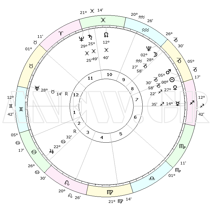 | | ΘΕΣΕΙΣ ΠΛΑΝΗΤΩΝ ΑΣΤΡΟΛΟΓΙΚΟΥ ΧΑΡΤΗ ΤΗΣ ΣΤΙΓΜΗΣ ΑΥΤΗΣ | | | | Πλανήτης | Ζώδιο | Μοίρες | Δεκαήμ. | Σε οίκο | Απόκλιση | | Ακμές των οίκων | | Ηλιος | Αιγόκερως | 00°53' | Πρώτο | 9 | 23 S 26 | | 1ος | 07°45' | Ταύρος | | Σελήνη | Αιγόκερως | 27°59' | Τρίτο | 10 | 23 S 57 | | 2ος | 07°52' | Δίδυμοι | | Ερμής | Τοξότης | 14°28' | Δεύτερο | 8 | 21 S 57 | | 3ος | 00°41' | Καρκίνος | | Αφροδίτη | Τοξότης | 27°15' | Τρίτο | 8 | 23 S 32 | | 4ος | 22°28' | Καρκίνος | | Αρης | Αιγόκερως | 05°27' | Πρώτο | 9 | 24 S 09 | | 5ος | 17°42' | Λέων | | Δίας | Καρκίνος | 22°32'R | Τρίτο | 4 | 21 N 46 | | 6ος | 21°58' | Παρθένος | | Κρόνος | Ιχθείς | 25°48' | Τρίτο | 12 | 03 S 46 | | 7ος | 07°45' | Σκορπιός | | Ουρανός | Ταύρος | 28°14'R | Τρίτο | 1 | 19 N 34 | | 8ος | 07°52' | Τοξότης | | Ποσειδώνας | Ιχθείς | 29°25' | Τρίτο | 12 | 01 S 28 | | 9ος | 00°41' | Αιγόκερως | | Πλούτωνας | Υδροχόος | 02°27' | Πρώτο | 10 | 23 S 17 | | 10ος | 22°28' | Αιγόκερως | | Β. Δεσμός | Ιχθείς | 12°40' | Δεύτερο | 11 | 06 S 48 | | 11ος | 17°42' | Υδροχόος | | Ωροσκόπος | Ταύρος | 07°45' | Πρώτο | | | 12ος | 21°58' | Ιχθείς | | Μεσουράνημα | Αιγόκερως | 22°28' | Τρίτο | | | |