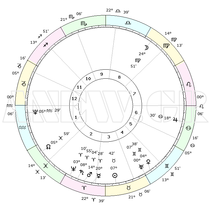 | | ΘΕΣΕΙΣ ΠΛΑΝΗΤΩΝ ΑΣΤΡΟΛΟΓΙΚΟΥ ΧΑΡΤΗ ΤΗΣ ΣΤΙΓΜΗΣ ΑΥΤΗΣ | | | | Πλανήτης | Ζώδιο | Μοίρες | Δεκαήμ. | Σε οίκο | Απόκλιση | | Ακμές των οίκων | | Ηλιος | Ταύρος | 07°39' | Πρώτο | 4 | 14 N 03 | | 1ος | 04°46' | Αιγόκερως | | Σελήνη | Παρθένος | 23°60' | Τρίτο | 9 | 01 N 02 | | 2ος | 13°08' | Υδροχόος | | Ερμής | Κριός | 20°21' | Τρίτο | 3 | 05 N 53 | | 3ος | 23°23' | Ιχθείς | | Αφροδίτη | Δίδυμοι | 04°33' | Πρώτο | 5 | 21 N 48 | | 4ος | 26°31' | Κριός | | Αρης | Κριός | 14°00' | Δεύτερο | 3 | 04 N 41 | | 5ος | 22°06' | Ταύρος | | Δίας | Καρκίνος | 18°30' | Δεύτερο | 7 | 22 N 32 | | 6ος | 13°38' | Δίδυμοι | | Κρόνος | Κριός | 08°55' | Πρώτο | 3 | 01 N 32 | | 7ος | 04°46' | Καρκίνος | | Ουρανός | Δίδυμοι | 00°06' | Πρώτο | 5 | 20 N 00 | | 8ος | 13°08' | Λέων | | Ποσειδώνας | Κριός | 03°10' | Πρώτο | 3 | 00 N 03 | | 9ος | 23°23' | Παρθένος | | Πλούτωνας | Υδροχόος | 05°29' | Πρώτο | 1 | 22 S 48 | | 10ος | 26°31' | Ζυγός | | Β. Δεσμός | Ιχθείς | 05°59' | Πρώτο | 2 | 09 S 19 | | 11ος | 22°06' | Σκορπιός | | Ωροσκόπος | Αιγόκερως | 04°46' | Πρώτο | | | 12ος | 13°38' | Τοξότης | | Μεσουράνημα | Ζυγός | 26°31' | Τρίτο | | | |