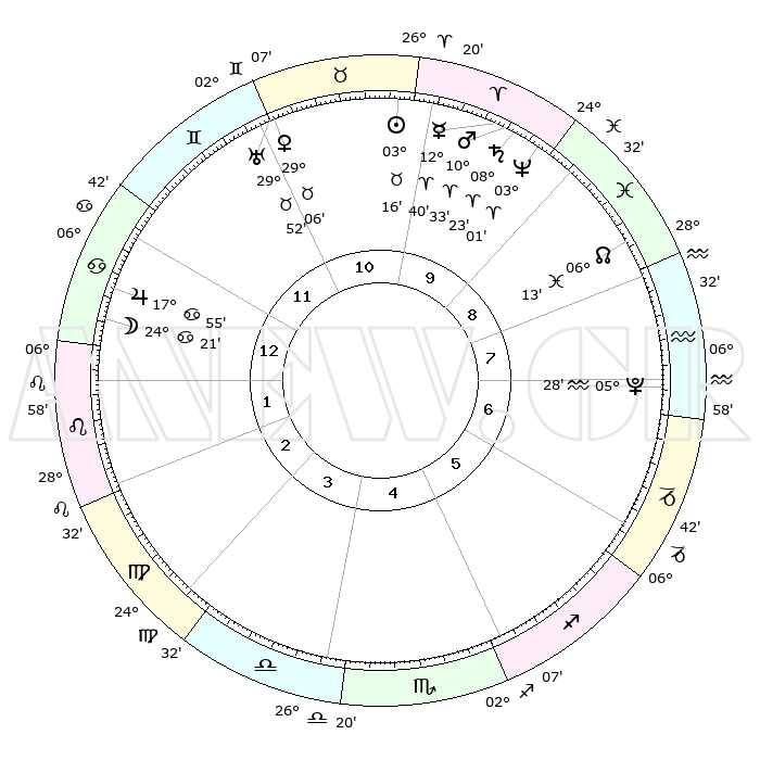 | | ΘΕΣΕΙΣ ΠΛΑΝΗΤΩΝ ΑΣΤΡΟΛΟΓΙΚΟΥ ΧΑΡΤΗ ΤΗΣ ΣΤΙΓΜΗΣ ΑΥΤΗΣ | | | | Πλανήτης | Ζώδιο | Μοίρες | Δεκαήμ. | Σε οίκο | Απόκλιση | | Ακμές των οίκων | | Ηλιος | Ταύρος | 03°13' | Πρώτο | 10 | 12 N 35 | | 1ος | 21°04' | Καρκίνος | | Σελήνη | Καρκίνος | 23°36' | Τρίτο | 1 | 24 N 51 | | 2ος | 11°39' | Λέων | | Ερμής | Κριός | 12°34' | Δεύτερο | 10 | 02 N 39 | | 3ος | 05°32' | Παρθένος | | Αφροδίτη | Ταύρος | 29°02' | Τρίτο | 11 | 20 N 29 | | 4ος | 05°18' | Ζυγός | | Αρης | Κριός | 10°31' | Δεύτερο | 10 | 03 N 18 | | 5ος | 11°20' | Σκορπιός | | Δίας | Καρκίνος | 17°55' | Δεύτερο | 12 | 22 N 37 | | 6ος | 18°33' | Τοξότης | | Κρόνος | Κριός | 08°23' | Πρώτο | 10 | 01 N 20 | | 7ος | 21°04' | Αιγόκερως | | Ουρανός | Ταύρος | 29°52' | Τρίτο | 11 | 19 N 57 | | 8ος | 11°39' | Υδροχόος | | Ποσειδώνας | Κριός | 03°01' | Πρώτο | 9 | 00 S 01 | | 9ος | 05°31' | Ιχθείς | | Πλούτωνας | Υδροχόος | 05°28' | Πρώτο | 7 | 22 S 48 | | 10ος | 05°18' | Κριός | | Β. Δεσμός | Ιχθείς | 06°13' | Πρώτο | 9 | 09 S 14 | | 11ος | 11°20' | Ταύρος | | Ωροσκόπος | Καρκίνος | 21°04' | Τρίτο | | | 12ος | 18°33' | Δίδυμοι | | Μεσουράνημα | Κριός | 05°18' | Πρώτο | | | |