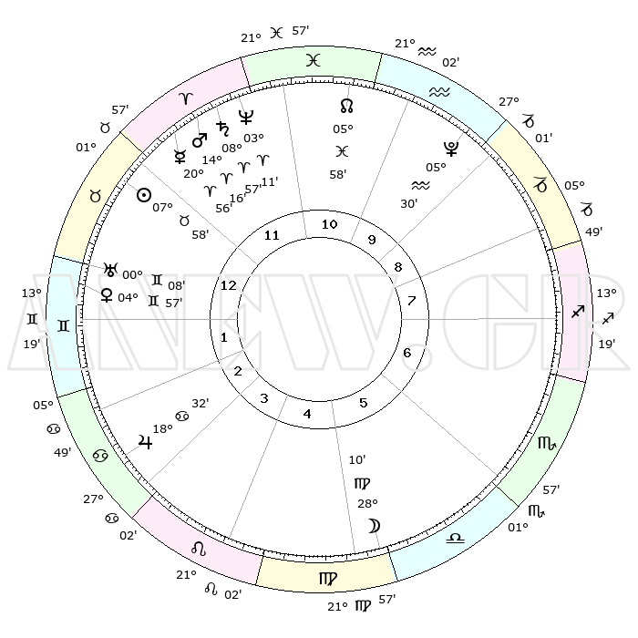 | | ΘΕΣΕΙΣ ΠΛΑΝΗΤΩΝ ΑΣΤΡΟΛΟΓΙΚΟΥ ΧΑΡΤΗ ΤΗΣ ΣΤΙΓΜΗΣ ΑΥΤΗΣ | | | | Πλανήτης | Ζώδιο | Μοίρες | Δεκαήμ. | Σε οίκο | Απόκλιση | | Ακμές των οίκων | | Ηλιος | Ταύρος | 07°54' | Πρώτο | 12 | 14 N 08 | | 1ος | 16°29' | Ταύρος | | Σελήνη | Παρθένος | 27°22' | Τρίτο | 5 | 00 S 33 | | 2ος | 14°21' | Δίδυμοι | | Ερμής | Κριός | 20°49' | Τρίτο | 12 | 06 N 05 | | 3ος | 06°29' | Καρκίνος | | Αφροδίτη | Δίδυμοι | 04°52' | Πρώτο | 1 | 21 N 52 | | 4ος | 28°30' | Καρκίνος | | Αρης | Κριός | 14°13' | Δεύτερο | 12 | 04 N 46 | | 5ος | 24°51' | Λέων | | Δίας | Καρκίνος | 18°32' | Δεύτερο | 3 | 22 N 32 | | 6ος | 00°51' | Ζυγός | | Κρόνος | Κριός | 08°56' | Πρώτο | 12 | 01 N 33 | | 7ος | 16°29' | Σκορπιός | | Ουρανός | Δίδυμοι | 00°07' | Πρώτο | 1 | 20 N 01 | | 8ος | 14°21' | Τοξότης | | Ποσειδώνας | Κριός | 03°10' | Πρώτο | 12 | 00 N 03 | | 9ος | 06°29' | Αιγόκερως | | Πλούτωνας | Υδροχόος | 05°30' | Πρώτο | 10 | 22 S 48 | | 10ος | 28°30' | Αιγόκερως | | Β. Δεσμός | Ιχθείς | 05°58' | Πρώτο | 11 | 09 S 19 | | 11ος | 24°51' | Υδροχόος | | Ωροσκόπος | Ταύρος | 16°29' | Δεύτερο | | | 12ος | 00°51' | Κριός | | Μεσουράνημα | Αιγόκερως | 28°30' | Τρίτο | | | |