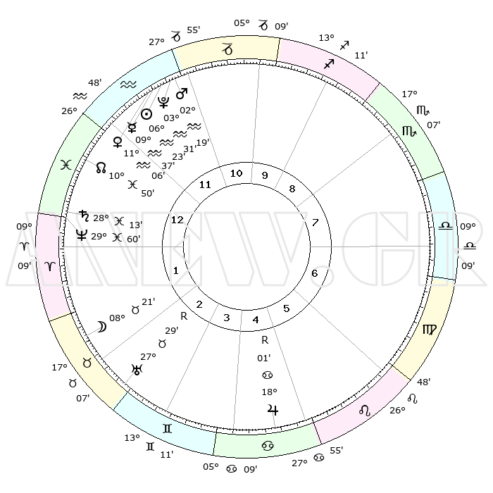 | | ΘΕΣΕΙΣ ΠΛΑΝΗΤΩΝ ΑΣΤΡΟΛΟΓΙΚΟΥ ΧΑΡΤΗ ΤΗΣ ΣΤΙΓΜΗΣ ΑΥΤΗΣ | | | | Πλανήτης | Ζώδιο | Μοίρες | Δεκαήμ. | Σε οίκο | Απόκλιση | | Ακμές των οίκων | | Ηλιος | Υδροχόος | 06°19' | Πρώτο | 12 | 18 S 41 | | 1ος | 28°50' | Υδροχόος | | Σελήνη | Ταύρος | 07°22' | Πρώτο | 2 | 18 N 08 | | 2ος | 14°21' | Κριός | | Ερμής | Υδροχόος | 09°30' | Πρώτο | 12 | 19 S 53 | | 3ος | 17°17' | Ταύρος | | Αφροδίτη | Υδροχόος | 11°00' | Δεύτερο | 12 | 18 S 41 | | 4ος | 11°48' | Δίδυμοι | | Αρης | Υδροχόος | 02°16' | Πρώτο | 12 | 20 S 39 | | 5ος | 03°30' | Καρκίνος | | Δίας | Καρκίνος | 18°01'R | Δεύτερο | 5 | 22 N 31 | | 6ος | 26°56' | Καρκίνος | | Κρόνος | Ιχθείς | 28°13' | Τρίτο | 1 | 02 S 43 | | 7ος | 28°50' | Λέων | | Ουρανός | Ταύρος | 27°29'R | Τρίτο | 3 | 19 N 25 | | 8ος | 14°21' | Ζυγός | | Ποσειδώνας | Ιχθείς | 29°60' | Τρίτο | 1 | 01 S 13 | | 9ος | 17°17' | Σκορπιός | | Πλούτωνας | Υδροχόος | 03°31' | Πρώτο | 12 | 23 S 03 | | 10ος | 11°48' | Τοξότης | | Β. Δεσμός | Ιχθείς | 10°50' | Δεύτερο | 1 | 07 S 30 | | 11ος | 03°30' | Αιγόκερως | | Ωροσκόπος | Υδροχόος | 28°50' | Τρίτο | | | 12ος | 26°56' | Αιγόκερως | | Μεσουράνημα | Τοξότης | 11°48' | Δεύτερο | | | |