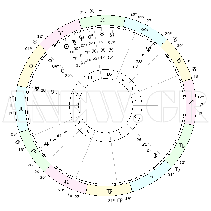 | | ΘΕΣΕΙΣ ΠΛΑΝΗΤΩΝ ΑΣΤΡΟΛΟΓΙΚΟΥ ΧΑΡΤΗ ΤΗΣ ΣΤΙΓΜΗΣ ΑΥΤΗΣ | | | | Πλανήτης | Ζώδιο | Μοίρες | Δεκαήμ. | Σε οίκο | Απόκλιση | | Ακμές των οίκων | | Ηλιος | Κριός | 13°29' | Δεύτερο | 12 | 05 N 19 | | 1ος | 13°41' | Ταύρος | | Σελήνη | Ζυγός | 26°36' | Τρίτο | 6 | 13 S 50 | | 2ος | 12°15' | Δίδυμοι | | Ερμής | Ιχθείς | 15°43' | Δεύτερο | 11 | 07 S 08 | | 3ος | 04°35' | Καρκίνος | | Αφροδίτη | Ταύρος | 04°24' | Πρώτο | 12 | 12 N 39 | | 4ος | 26°31' | Καρκίνος | | Αρης | Ιχθείς | 24°52' | Τρίτο | 11 | 02 S 59 | | 5ος | 22°29' | Λέων | | Δίας | Καρκίνος | 15°56' | Δεύτερο | 3 | 22 N 51 | | 6ος | 27°56' | Παρθένος | | Κρόνος | Κριός | 05°56' | Πρώτο | 12 | 00 N 24 | | 7ος | 13°41' | Σκορπιός | | Ουρανός | Ταύρος | 28°52' | Τρίτο | 1 | 19 N 44 | | 8ος | 12°15' | Τοξότης | | Ποσειδώνας | Κριός | 02°18' | Πρώτο | 12 | 00 S 17 | | 9ος | 04°35' | Αιγόκερως | | Πλούτωνας | Υδροχόος | 05°15' | Πρώτο | 10 | 22 S 47 | | 10ος | 26°31' | Αιγόκερως | | Β. Δεσμός | Ιχθείς | 07°17' | Πρώτο | 11 | 08 S 50 | | 11ος | 22°29' | Υδροχόος | | Ωροσκόπος | Ταύρος | 13°41' | Δεύτερο | | | 12ος | 27°56' | Ιχθείς | | Μεσουράνημα | Αιγόκερως | 26°31' | Τρίτο | | | |