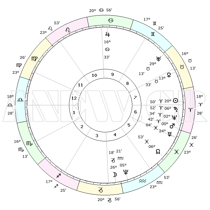 | | ΘΕΣΕΙΣ ΠΛΑΝΗΤΩΝ ΑΣΤΡΟΛΟΓΙΚΟΥ ΧΑΡΤΗ ΤΗΣ ΣΤΙΓΜΗΣ ΑΥΤΗΣ | | | | Πλανήτης | Ζώδιο | Μοίρες | Δεκαήμ. | Σε οίκο | Απόκλιση | | Ακμές των οίκων | | Ηλιος | Κριός | 20°46' | Τρίτο | 7 | 08 N 06 | | 1ος | 28°50' | Παρθένος | | Σελήνη | Αιγόκερως | 25°29' | Τρίτο | 4 | 24 S 29 | | 2ος | 25°20' | Ζυγός | | Ερμής | Ιχθείς | 23°59' | Τρίτο | 6 | 04 S 34 | | 3ος | 25°43' | Σκορπιός | | Αφροδίτη | Ταύρος | 13°29' | Δεύτερο | 8 | 15 N 51 | | 4ος | 28°41' | Τοξότης | | Αρης | Κριός | 00°38' | Πρώτο | 7 | 00 S 40 | | 5ος | 01°41' | Υδροχόος | | Δίας | Καρκίνος | 16°32' | Δεύτερο | 10 | 22 N 47 | | 6ος | 02°10' | Ιχθείς | | Κρόνος | Κριός | 06°51' | Πρώτο | 7 | 00 N 45 | | 7ος | 28°50' | Ιχθείς | | Ουρανός | Ταύρος | 29°12' | Τρίτο | 9 | 19 N 49 | | 8ος | 25°20' | Κριός | | Ποσειδώνας | Κριός | 02°34' | Πρώτο | 7 | 00 S 11 | | 9ος | 25°43' | Ταύρος | | Πλούτωνας | Υδροχόος | 05°21' | Πρώτο | 5 | 22 S 47 | | 10ος | 28°41' | Δίδυμοι | | Β. Δεσμός | Ιχθείς | 06°54' | Πρώτο | 6 | 08 S 59 | | 11ος | 01°41' | Λέων | | Ωροσκόπος | Παρθένος | 28°50' | Τρίτο | | | 12ος | 02°10' | Παρθένος | | Μεσουράνημα | Δίδυμοι | 28°41' | Τρίτο | | | |