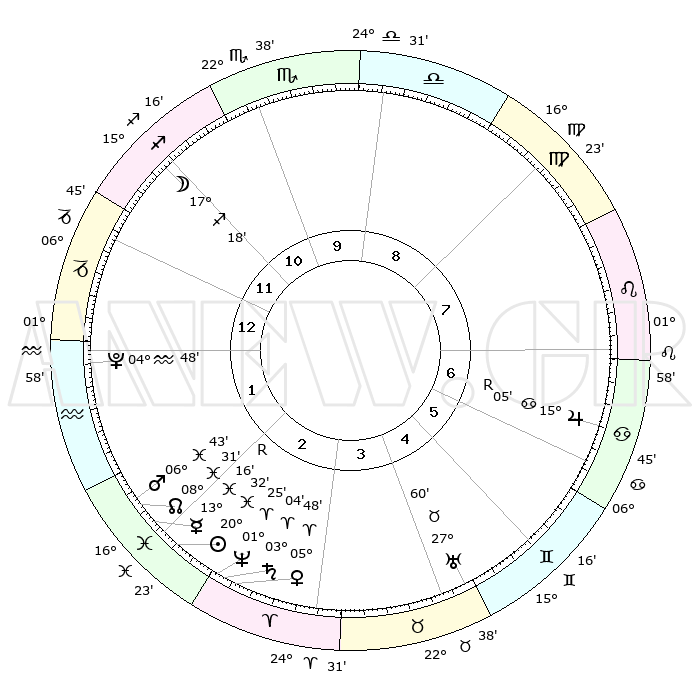 | | ΘΕΣΕΙΣ ΠΛΑΝΗΤΩΝ ΑΣΤΡΟΛΟΓΙΚΟΥ ΧΑΡΤΗ ΤΗΣ ΣΤΙΓΜΗΣ ΑΥΤΗΣ | | | | Πλανήτης | Ζώδιο | Μοίρες | Δεκαήμ. | Σε οίκο | Απόκλιση | | Ακμές των οίκων | | Ηλιος | Ιχθείς | 20°29' | Τρίτο | 2 | 03 S 46 | | 1ος | 13°42' | Αιγόκερως | | Σελήνη | Τοξότης | 16°45' | Δεύτερο | 11 | 27 S 58 | | 2ος | 24°21' | Υδροχόος | | Ερμής | Ιχθείς | 13°18'R | Δεύτερο | 2 | 03 S 35 | | 3ος | 04°31' | Κριός | | Αφροδίτη | Κριός | 05°45' | Πρώτο | 3 | 01 N 13 | | 4ος | 06°00' | Ταύρος | | Αρης | Ιχθείς | 06°41' | Πρώτο | 2 | 10 S 04 | | 5ος | 00°22' | Δίδυμοι | | Δίας | Καρκίνος | 15°05'R | Δεύτερο | 7 | 22 N 56 | | 6ος | 21°37' | Δίδυμοι | | Κρόνος | Κριός | 03°03' | Πρώτο | 2 | 00 S 44 | | 7ος | 13°42' | Καρκίνος | | Ουρανός | Ταύρος | 27°59' | Τρίτο | 4 | 19 N 32 | | 8ος | 24°21' | Λέων | | Ποσειδώνας | Κριός | 01°25' | Πρώτο | 2 | 00 S 38 | | 9ος | 04°31' | Ζυγός | | Πλούτωνας | Υδροχόος | 04°48' | Πρώτο | 1 | 22 S 50 | | 10ος | 06°00' | Σκορπιός | | Β. Δεσμός | Ιχθείς | 08°31' | Πρώτο | 2 | 08 S 23 | | 11ος | 00°22' | Τοξότης | | Ωροσκόπος | Αιγόκερως | 13°42' | Δεύτερο | | | 12ος | 21°37' | Τοξότης | | Μεσουράνημα | Σκορπιός | 06°00' | Πρώτο | | | |