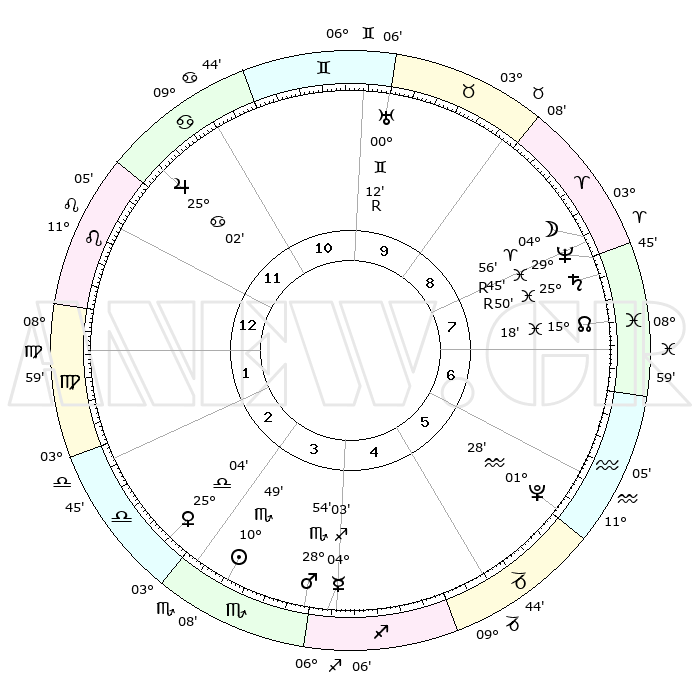| | ΘΕΣΕΙΣ ΠΛΑΝΗΤΩΝ ΑΣΤΡΟΛΟΓΙΚΟΥ ΧΑΡΤΗ ΤΗΣ ΣΤΙΓΜΗΣ ΑΥΤΗΣ | | | | Πλανήτης | Ζώδιο | Μοίρες | Δεκαήμ. | Σε οίκο | Απόκλιση | | Ακμές των οίκων | | Ηλιος | Σκορπιός | 10°33' | Δεύτερο | 5 | 14 S 59 | | 1ος | 21°11' | Δίδυμοι | | Σελήνη | Κριός | 01°12' | Πρώτο | 10 | 01 N 38 | | 2ος | 12°43' | Καρκίνος | | Ερμής | Τοξότης | 03°52' | Πρώτο | 6 | 23 S 45 | | 3ος | 04°05' | Λέων | | Αφροδίτη | Ζυγός | 24°45' | Τρίτο | 5 | 08 S 14 | | 4ος | 29°05' | Λέων | | Αρης | Σκορπιός | 28°43' | Τρίτο | 6 | 20 S 16 | | 5ος | 01°29' | Ζυγός | | Δίας | Καρκίνος | 25°01' | Τρίτο | 2 | 21 N 13 | | 6ος | 11°47' | Σκορπιός | | Κρόνος | Ιχθείς | 25°51'R | Τρίτο | 10 | 03 S 55 | | 7ος | 21°11' | Τοξότης | | Ουρανός | Δίδυμοι | 00°12'R | Πρώτο | 12 | 19 N 59 | | 8ος | 12°43' | Αιγόκερως | | Ποσειδώνας | Ιχθείς | 29°45'R | Τρίτο | 10 | 01 S 21 | | 9ος | 04°05' | Υδροχόος | | Πλούτωνας | Υδροχόος | 01°28' | Πρώτο | 8 | 23 S 31 | | 10ος | 29°05' | Υδροχόος | | Β. Δεσμός | Ιχθείς | 15°18' | Δεύτερο | 10 | 05 S 47 | | 11ος | 01°29' | Κριός | | Ωροσκόπος | Δίδυμοι | 21°11' | Τρίτο | | | 12ος | 11°47' | Ταύρος | | Μεσουράνημα | Υδροχόος | 29°05' | Τρίτο | | | |