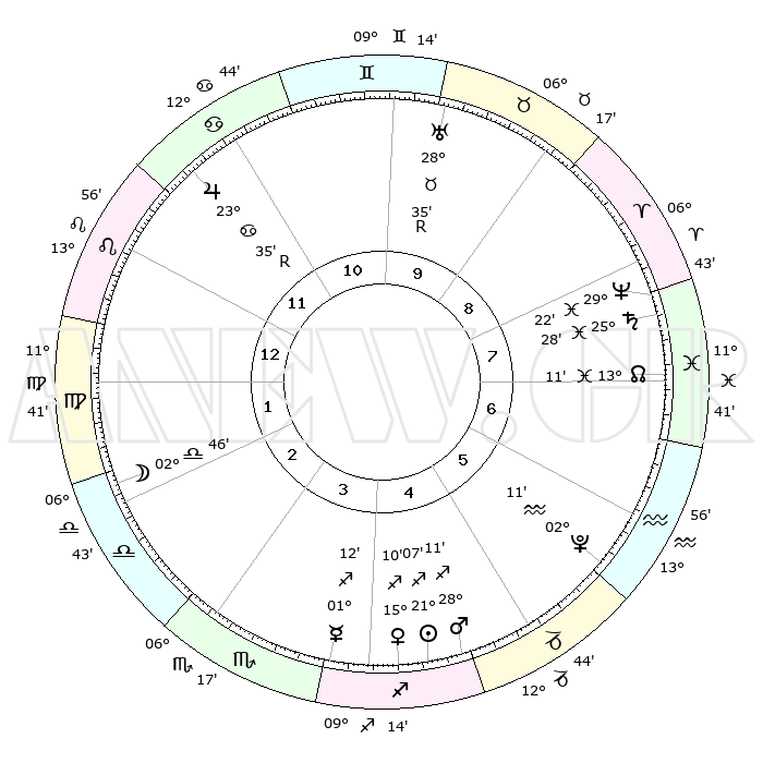 | | ΘΕΣΕΙΣ ΠΛΑΝΗΤΩΝ ΑΣΤΡΟΛΟΓΙΚΟΥ ΧΑΡΤΗ ΤΗΣ ΣΤΙΓΜΗΣ ΑΥΤΗΣ | | | | Πλανήτης | Ζώδιο | Μοίρες | Δεκαήμ. | Σε οίκο | Απόκλιση | | Ακμές των οίκων | | Ηλιος | Τοξότης | 20°57' | Τρίτο | 5 | 23 S 07 | | 1ος | 24°23' | Καρκίνος | | Σελήνη | Ζυγός | 00°46' | Πρώτο | 3 | 01 S 43 | | 2ος | 15°05' | Λέων | | Ερμής | Τοξότης | 00°59' | Πρώτο | 5 | 18 S 35 | | 3ος | 09°23' | Παρθένος | | Αφροδίτη | Τοξότης | 14°58' | Δεύτερο | 5 | 22 S 20 | | 4ος | 09°40' | Ζυγός | | Αρης | Τοξότης | 28°04' | Τρίτο | 6 | 24 S 11 | | 5ος | 15°45' | Σκορπιός | | Δίας | Καρκίνος | 23°35'R | Τρίτο | 12 | 21 N 34 | | 6ος | 22°24' | Τοξότης | | Κρόνος | Ιχθείς | 25°28' | Τρίτο | 9 | 03 S 56 | | 7ος | 24°23' | Αιγόκερως | | Ουρανός | Ταύρος | 28°35'R | Τρίτο | 11 | 19 N 38 | | 8ος | 15°05' | Υδροχόος | | Ποσειδώνας | Ιχθείς | 29°22' | Τρίτο | 9 | 01 S 29 | | 9ος | 09°23' | Ιχθείς | | Πλούτωνας | Υδροχόος | 02°11' | Πρώτο | 7 | 23 S 20 | | 10ος | 09°40' | Κριός | | Β. Δεσμός | Ιχθείς | 13°11' | Δεύτερο | 9 | 06 S 36 | | 11ος | 15°45' | Ταύρος | | Ωροσκόπος | Καρκίνος | 24°23' | Τρίτο | | | 12ος | 22°24' | Δίδυμοι | | Μεσουράνημα | Κριός | 09°40' | Πρώτο | | | |