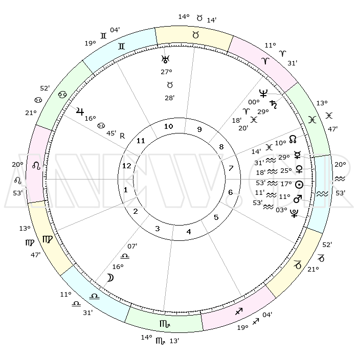 | | ΘΕΣΕΙΣ ΠΛΑΝΗΤΩΝ ΑΣΤΡΟΛΟΓΙΚΟΥ ΧΑΡΤΗ ΤΗΣ ΣΤΙΓΜΗΣ ΑΥΤΗΣ | | | | Πλανήτης | Ζώδιο | Μοίρες | Δεκαήμ. | Σε οίκο | Απόκλιση | | Ακμές των οίκων | | Ηλιος | Υδροχόος | 17°48' | Δεύτερο | 7 | 15 S 29 | | 1ος | 29°44' | Καρκίνος | | Σελήνη | Ζυγός | 15°12' | Δεύτερο | 3 | 08 S 50 | | 2ος | 20°45' | Λέων | | Ερμής | Υδροχόος | 29°24' | Τρίτο | 8 | 12 S 59 | | 3ος | 15°45' | Παρθένος | | Αφροδίτη | Υδροχόος | 25°13' | Τρίτο | 8 | 14 S 28 | | 4ος | 16°45' | Ζυγός | | Αρης | Υδροχόος | 11°07' | Δεύτερο | 7 | 18 S 27 | | 5ος | 22°49' | Σκορπιός | | Δίας | Καρκίνος | 16°46'R | Δεύτερο | 12 | 22 N 42 | | 6ος | 28°34' | Τοξότης | | Κρόνος | Ιχθείς | 29°19' | Τρίτο | 9 | 02 S 15 | | 7ος | 29°44' | Αιγόκερως | | Ουρανός | Ταύρος | 27°28' | Τρίτο | 11 | 19 N 24 | | 8ος | 20°45' | Υδροχόος | | Ποσειδώνας | Κριός | 00°18' | Πρώτο | 9 | 01 S 05 | | 9ος | 15°45' | Ιχθείς | | Πλούτωνας | Υδροχόος | 03°53' | Πρώτο | 7 | 22 S 59 | | 10ος | 16°45' | Κριός | | Β. Δεσμός | Ιχθείς | 10°14' | Δεύτερο | 8 | 07 S 44 | | 11ος | 22°49' | Ταύρος | | Ωροσκόπος | Καρκίνος | 29°44' | Τρίτο | | | 12ος | 28°34' | Δίδυμοι | | Μεσουράνημα | Κριός | 16°45' | Δεύτερο | | | |