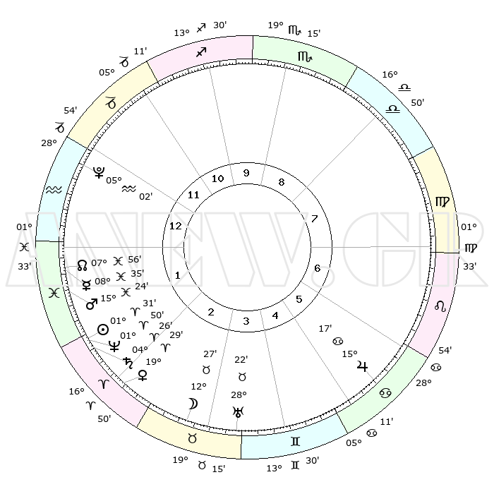 | | ΘΕΣΕΙΣ ΠΛΑΝΗΤΩΝ ΑΣΤΡΟΛΟΓΙΚΟΥ ΧΑΡΤΗ ΤΗΣ ΣΤΙΓΜΗΣ ΑΥΤΗΣ | | | | Πλανήτης | Ζώδιο | Μοίρες | Δεκαήμ. | Σε οίκο | Απόκλιση | | Ακμές των οίκων | | Ηλιος | Κριός | 01°27' | Πρώτο | 2 | 00 N 35 | | 1ος | 01°09' | Υδροχόος | | Σελήνη | Ταύρος | 11°33' | Δεύτερο | 3 | 19 N 43 | | 2ος | 15°26' | Ιχθείς | | Ερμής | Ιχθείς | 08°34' | Πρώτο | 1 | 07 S 43 | | 3ος | 23°42' | Κριός | | Αφροδίτη | Κριός | 19°24' | Δεύτερο | 2 | 06 N 50 | | 4ος | 21°58' | Ταύρος | | Αρης | Ιχθείς | 15°21' | Δεύτερο | 1 | 06 S 46 | | 5ος | 14°38' | Δίδυμοι | | Δίας | Καρκίνος | 15°17' | Δεύτερο | 6 | 22 N 55 | | 6ος | 06°06' | Καρκίνος | | Κρόνος | Κριός | 04°25' | Πρώτο | 2 | 00 S 12 | | 7ος | 01°09' | Λέων | | Ουρανός | Ταύρος | 28°22' | Τρίτο | 4 | 19 N 37 | | 8ος | 15°26' | Παρθένος | | Ποσειδώνας | Κριός | 01°50' | Πρώτο | 2 | 00 S 28 | | 9ος | 23°42' | Ζυγός | | Πλούτωνας | Υδροχόος | 05°02' | Πρώτο | 1 | 22 S 48 | | 10ος | 21°58' | Σκορπιός | | Β. Δεσμός | Ιχθείς | 07°56' | Πρώτο | 1 | 08 S 36 | | 11ος | 14°38' | Τοξότης | | Ωροσκόπος | Υδροχόος | 01°09' | Πρώτο | | | 12ος | 06°06' | Αιγόκερως | | Μεσουράνημα | Σκορπιός | 21°58' | Τρίτο | | | |