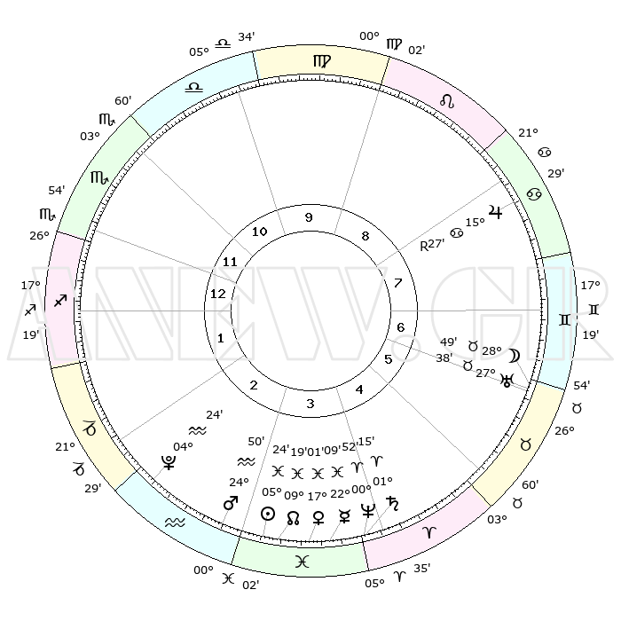 | | ΘΕΣΕΙΣ ΠΛΑΝΗΤΩΝ ΑΣΤΡΟΛΟΓΙΚΟΥ ΧΑΡΤΗ ΤΗΣ ΣΤΙΓΜΗΣ ΑΥΤΗΣ | | | | Πλανήτης | Ζώδιο | Μοίρες | Δεκαήμ. | Σε οίκο | Απόκλιση | | Ακμές των οίκων | | Ηλιος | Ιχθείς | 05°21' | Πρώτο | 3 | 09 S 33 | | 1ος | 28°39' | Σκορπιός | | Σελήνη | Ταύρος | 27°56' | Τρίτο | 6 | 24 N 45 | | 2ος | 29°36' | Τοξότης | | Ερμής | Ιχθείς | 22°07' | Τρίτο | 4 | 01 S 03 | | 3ος | 05°05' | Υδροχόος | | Αφροδίτη | Ιχθείς | 16°56' | Δεύτερο | 4 | 06 S 28 | | 4ος | 11°06' | Ιχθείς | | Αρης | Υδροχόος | 24°47' | Τρίτο | 3 | 14 S 17 | | 5ος | 12°18' | Κριός | | Δίας | Καρκίνος | 15°28'R | Δεύτερο | 8 | 22 N 52 | | 6ος | 07°31' | Ταύρος | | Κρόνος | Κριός | 01°15' | Πρώτο | 4 | 01 S 28 | | 7ος | 28°39' | Ταύρος | | Ουρανός | Ταύρος | 27°38' | Τρίτο | 6 | 19 N 27 | | 8ος | 29°36' | Δίδυμοι | | Ποσειδώνας | Κριός | 00°52' | Πρώτο | 4 | 00 S 51 | | 9ος | 05°05' | Λέων | | Πλούτωνας | Υδροχόος | 04°24' | Πρώτο | 2 | 22 S 54 | | 10ος | 11°06' | Παρθένος | | Β. Δεσμός | Ιχθείς | 09°19' | Πρώτο | 3 | 08 S 05 | | 11ος | 12°18' | Ζυγός | | Ωροσκόπος | Σκορπιός | 28°39' | Τρίτο | | | 12ος | 07°31' | Σκορπιός | | Μεσουράνημα | Παρθένος | 11°06' | Δεύτερο | | | |