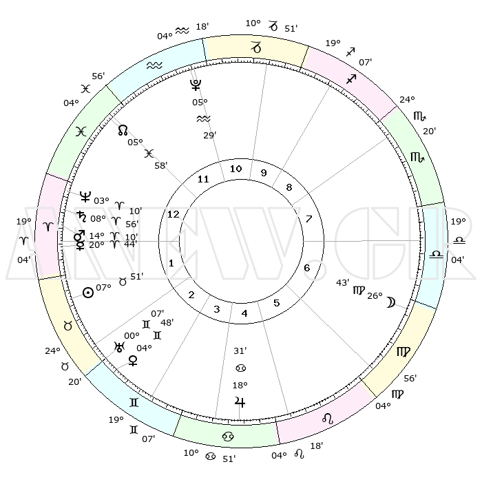 | | ΘΕΣΕΙΣ ΠΛΑΝΗΤΩΝ ΑΣΤΡΟΛΟΓΙΚΟΥ ΧΑΡΤΗ ΤΗΣ ΣΤΙΓΜΗΣ ΑΥΤΗΣ | | | | Πλανήτης | Ζώδιο | Μοίρες | Δεκαήμ. | Σε οίκο | Απόκλιση | | Ακμές των οίκων | | Ηλιος | Ταύρος | 07°47' | Πρώτο | 2 | 14 N 06 | | 1ος | 12°12' | Ιχθείς | | Σελήνη | Παρθένος | 25°55' | Τρίτο | 7 | 00 N 08 | | 2ος | 26°09' | Κριός | | Ερμής | Κριός | 20°37' | Τρίτο | 1 | 06 N 00 | | 3ος | 26°32' | Ταύρος | | Αφροδίτη | Δίδυμοι | 04°44' | Πρώτο | 3 | 21 N 50 | | 4ος | 19°53' | Δίδυμοι | | Αρης | Κριός | 14°07' | Δεύτερο | 1 | 04 N 44 | | 5ος | 11°39' | Καρκίνος | | Δίας | Καρκίνος | 18°31' | Δεύτερο | 5 | 22 N 32 | | 6ος | 06°35' | Λέων | | Κρόνος | Κριός | 08°56' | Πρώτο | 1 | 01 N 33 | | 7ος | 12°12' | Παρθένος | | Ουρανός | Δίδυμοι | 00°07' | Πρώτο | 3 | 20 N 00 | | 8ος | 26°09' | Ζυγός | | Ποσειδώνας | Κριός | 03°10' | Πρώτο | 1 | 00 N 03 | | 9ος | 26°32' | Σκορπιός | | Πλούτωνας | Υδροχόος | 05°29' | Πρώτο | 11 | 22 S 48 | | 10ος | 19°53' | Τοξότης | | Β. Δεσμός | Ιχθείς | 05°58' | Πρώτο | 12 | 09 S 19 | | 11ος | 11°39' | Αιγόκερως | | Ωροσκόπος | Ιχθείς | 12°12' | Δεύτερο | | | 12ος | 06°35' | Υδροχόος | | Μεσουράνημα | Τοξότης | 19°53' | Δεύτερο | | | |