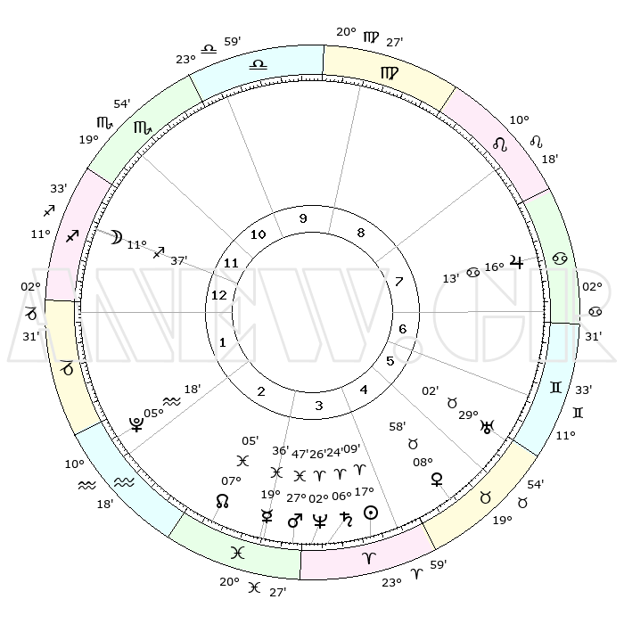 | | ΘΕΣΕΙΣ ΠΛΑΝΗΤΩΝ ΑΣΤΡΟΛΟΓΙΚΟΥ ΧΑΡΤΗ ΤΗΣ ΣΤΙΓΜΗΣ ΑΥΤΗΣ | | | | Πλανήτης | Ζώδιο | Μοίρες | Δεκαήμ. | Σε οίκο | Απόκλιση | | Ακμές των οίκων | | Ηλιος | Κριός | 17°05' | Δεύτερο | 4 | 06 N 43 | | 1ος | 13°19' | Τοξότης | | Σελήνη | Τοξότης | 10°54' | Δεύτερο | 12 | 27 S 11 | | 2ος | 16°39' | Αιγόκερως | | Ερμής | Ιχθείς | 19°32' | Δεύτερο | 3 | 06 S 02 | | 3ος | 24°36' | Υδροχόος | | Αφροδίτη | Ταύρος | 08°54' | Πρώτο | 5 | 14 N 17 | | 4ος | 00°25' | Κριός | | Αρης | Ιχθείς | 27°44' | Τρίτο | 3 | 01 S 50 | | 5ος | 29°30' | Κριός | | Δίας | Καρκίνος | 16°13' | Δεύτερο | 7 | 22 N 49 | | 6ος | 22°51' | Ταύρος | | Κρόνος | Κριός | 06°24' | Πρώτο | 4 | 00 N 35 | | 7ος | 13°19' | Δίδυμοι | | Ουρανός | Ταύρος | 29°02' | Τρίτο | 6 | 19 N 46 | | 8ος | 16°39' | Καρκίνος | | Ποσειδώνας | Κριός | 02°26' | Πρώτο | 4 | 00 S 14 | | 9ος | 24°36' | Λέων | | Πλούτωνας | Υδροχόος | 05°18' | Πρώτο | 2 | 22 S 47 | | 10ος | 00°25' | Ζυγός | | Β. Δεσμός | Ιχθείς | 07°05' | Πρώτο | 3 | 08 S 54 | | 11ος | 29°30' | Ζυγός | | Ωροσκόπος | Τοξότης | 13°19' | Δεύτερο | | | 12ος | 22°51' | Σκορπιός | | Μεσουράνημα | Ζυγός | 00°25' | Πρώτο | | | |