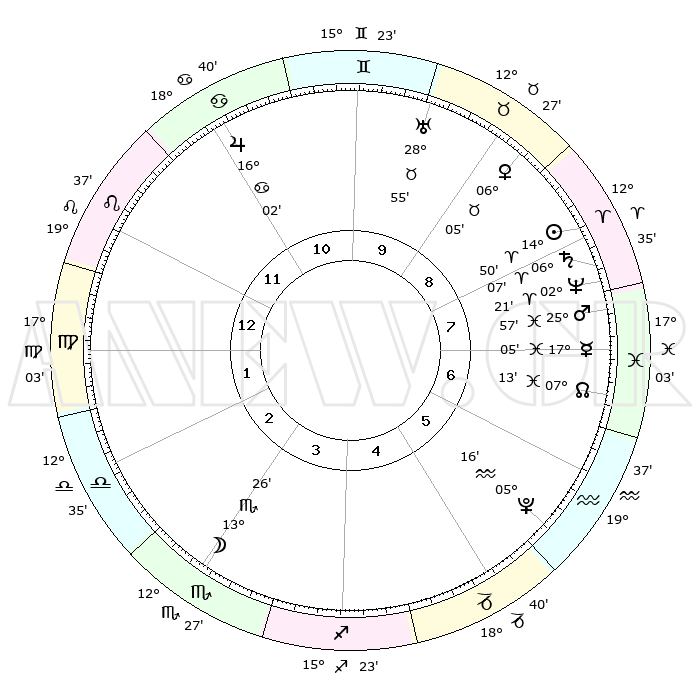 | | ΘΕΣΕΙΣ ΠΛΑΝΗΤΩΝ ΑΣΤΡΟΛΟΓΙΚΟΥ ΧΑΡΤΗ ΤΗΣ ΣΤΙΓΜΗΣ ΑΥΤΗΣ | | | | Πλανήτης | Ζώδιο | Μοίρες | Δεκαήμ. | Σε οίκο | Απόκλιση | | Ακμές των οίκων | | Ηλιος | Κριός | 14°46' | Δεύτερο | 8 | 05 N 49 | | 1ος | 27°45' | Λέων | | Σελήνη | Σκορπιός | 12°38' | Δεύτερο | 3 | 20 S 03 | | 2ος | 21°22' | Παρθένος | | Ερμής | Ιχθείς | 17°01' | Δεύτερο | 7 | 06 S 47 | | 3ος | 19°50' | Ζυγός | | Αφροδίτη | Ταύρος | 06°00' | Πρώτο | 9 | 13 N 14 | | 4ος | 22°43' | Σκορπιός | | Αρης | Ιχθείς | 25°54' | Τρίτο | 8 | 02 S 35 | | 5ος | 27°04' | Τοξότης | | Δίας | Καρκίνος | 16°02' | Δεύτερο | 11 | 22 N 50 | | 6ος | 29°12' | Αιγόκερως | | Κρόνος | Κριός | 06°06' | Πρώτο | 8 | 00 N 28 | | 7ος | 27°45' | Υδροχόος | | Ουρανός | Ταύρος | 28°55' | Τρίτο | 10 | 19 N 45 | | 8ος | 21°22' | Ιχθείς | | Ποσειδώνας | Κριός | 02°21' | Πρώτο | 8 | 00 S 16 | | 9ος | 19°50' | Κριός | | Πλούτωνας | Υδροχόος | 05°16' | Πρώτο | 6 | 22 S 47 | | 10ος | 22°43' | Ταύρος | | Β. Δεσμός | Ιχθείς | 07°13' | Πρώτο | 7 | 08 S 52 | | 11ος | 27°04' | Δίδυμοι | | Ωροσκόπος | Λέων | 27°45' | Τρίτο | | | 12ος | 29°12' | Καρκίνος | | Μεσουράνημα | Ταύρος | 22°43' | Τρίτο | | | |