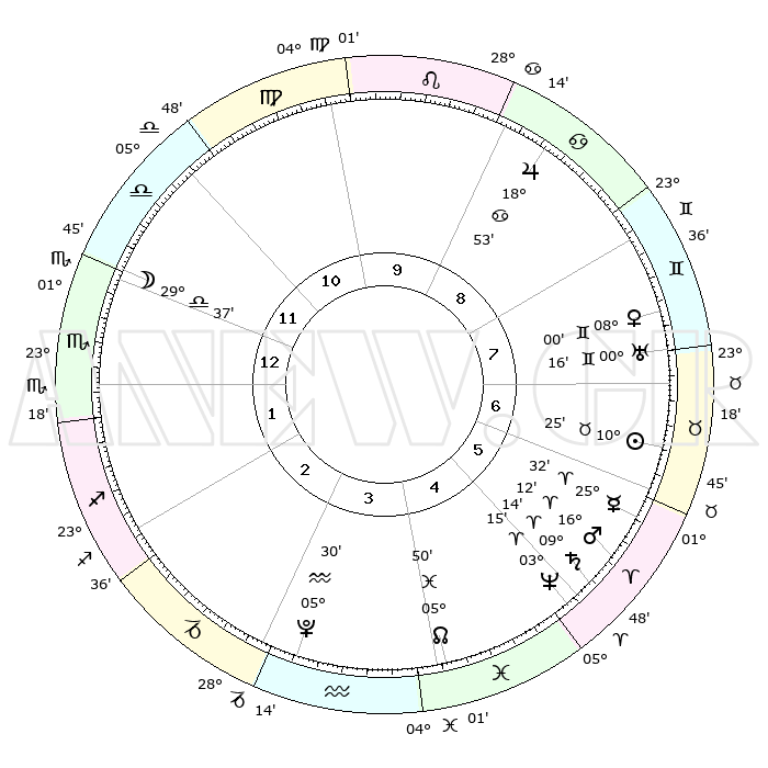 | | ΘΕΣΕΙΣ ΠΛΑΝΗΤΩΝ ΑΣΤΡΟΛΟΓΙΚΟΥ ΧΑΡΤΗ ΤΗΣ ΣΤΙΓΜΗΣ ΑΥΤΗΣ | | | | Πλανήτης | Ζώδιο | Μοίρες | Δεκαήμ. | Σε οίκο | Απόκλιση | | Ακμές των οίκων | | Ηλιος | Ταύρος | 10°22' | Δεύτερο | 7 | 14 N 56 | | 1ος | 09°25' | Σκορπιός | | Σελήνη | Ζυγός | 29°01' | Τρίτο | 12 | 14 S 51 | | 2ος | 08°27' | Τοξότης | | Ερμής | Κριός | 25°27' | Τρίτο | 6 | 08 N 01 | | 3ος | 11°17' | Αιγόκερως | | Αφροδίτη | Δίδυμοι | 07°57' | Πρώτο | 7 | 22 N 30 | | 4ος | 16°09' | Υδροχόος | | Αρης | Κριός | 16°10' | Δεύτερο | 5 | 05 N 32 | | 5ος | 18°51' | Ιχθείς | | Δίας | Καρκίνος | 18°53' | Δεύτερο | 9 | 22 N 29 | | 6ος | 16°33' | Κριός | | Κρόνος | Κριός | 09°14' | Πρώτο | 5 | 01 N 40 | | 7ος | 09°25' | Ταύρος | | Ουρανός | Δίδυμοι | 00°16' | Πρώτο | 7 | 20 N 02 | | 8ος | 08°27' | Δίδυμοι | | Ποσειδώνας | Κριός | 03°15' | Πρώτο | 5 | 00 N 05 | | 9ος | 11°17' | Καρκίνος | | Πλούτωνας | Υδροχόος | 05°30' | Πρώτο | 3 | 22 S 49 | | 10ος | 16°09' | Λέων | | Β. Δεσμός | Ιχθείς | 05°50' | Πρώτο | 4 | 09 S 22 | | 11ος | 18°51' | Παρθένος | | Ωροσκόπος | Σκορπιός | 09°25' | Πρώτο | | | 12ος | 16°33' | Ζυγός | | Μεσουράνημα | Λέων | 16°09' | Δεύτερο | | | |