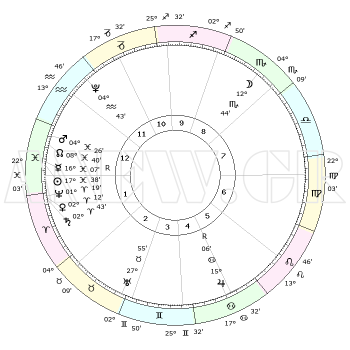 | | ΘΕΣΕΙΣ ΠΛΑΝΗΤΩΝ ΑΣΤΡΟΛΟΓΙΚΟΥ ΧΑΡΤΗ ΤΗΣ ΣΤΙΓΜΗΣ ΑΥΤΗΣ | | | | Πλανήτης | Ζώδιο | Μοίρες | Δεκαήμ. | Σε οίκο | Απόκλιση | | Ακμές των οίκων | | Ηλιος | Ιχθείς | 17°34' | Δεύτερο | 1 | 04 S 55 | | 1ος | 17°28' | Υδροχόος | | Σελήνη | Σκορπιός | 11°58' | Δεύτερο | 9 | 19 S 53 | | 2ος | 03°15' | Κριός | | Ερμής | Ιχθείς | 16°11'R | Δεύτερο | 1 | 02 S 08 | | 3ος | 08°28' | Ταύρος | | Αφροδίτη | Κριός | 02°07' | Πρώτο | 1 | 00 S 17 | | 4ος | 04°18' | Δίδυμοι | | Αρης | Ιχθείς | 04°23' | Πρώτο | 1 | 10 S 55 | | 5ος | 26°11' | Δίδυμοι | | Δίας | Καρκίνος | 15°06'R | Δεύτερο | 5 | 22 N 56 | | 6ος | 18°37' | Καρκίνος | | Κρόνος | Κριός | 02°42' | Πρώτο | 1 | 00 S 53 | | 7ος | 17°28' | Λέων | | Ουρανός | Ταύρος | 27°54' | Τρίτο | 3 | 19 N 31 | | 8ος | 03°15' | Ζυγός | | Ποσειδώνας | Κριός | 01°19' | Πρώτο | 1 | 00 S 41 | | 9ος | 08°28' | Σκορπιός | | Πλούτωνας | Υδροχόος | 04°43' | Πρώτο | 12 | 22 S 51 | | 10ος | 04°18' | Τοξότης | | Β. Δεσμός | Ιχθείς | 08°40' | Πρώτο | 1 | 08 S 19 | | 11ος | 26°11' | Τοξότης | | Ωροσκόπος | Υδροχόος | 17°28' | Δεύτερο | | | 12ος | 18°37' | Αιγόκερως | | Μεσουράνημα | Τοξότης | 04°18' | Πρώτο | | | |