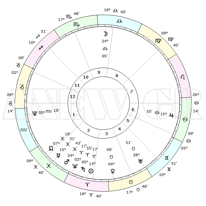| | ΘΕΣΕΙΣ ΠΛΑΝΗΤΩΝ ΑΣΤΡΟΛΟΓΙΚΟΥ ΧΑΡΤΗ ΤΗΣ ΣΤΙΓΜΗΣ ΑΥΤΗΣ | | | | Πλανήτης | Ζώδιο | Μοίρες | Δεκαήμ. | Σε οίκο | Απόκλιση | | Ακμές των οίκων | | Ηλιος | Κριός | 13°13' | Δεύτερο | 3 | 05 N 13 | | 1ος | 00°43' | Αιγόκερως | | Σελήνη | Ζυγός | 23°13' | Τρίτο | 10 | 12 S 24 | | 2ος | 08°03' | Υδροχόος | | Ερμής | Ιχθείς | 15°27' | Δεύτερο | 2 | 07 S 12 | | 3ος | 18°06' | Ιχθείς | | Αφροδίτη | Ταύρος | 04°04' | Πρώτο | 4 | 12 N 32 | | 4ος | 21°55' | Κριός | | Αρης | Ιχθείς | 24°39' | Τρίτο | 3 | 03 S 04 | | 5ος | 18°07' | Ταύρος | | Δίας | Καρκίνος | 15°55' | Δεύτερο | 7 | 22 N 51 | | 6ος | 09°53' | Δίδυμοι | | Κρόνος | Κριός | 05°54' | Πρώτο | 3 | 00 N 23 | | 7ος | 00°43' | Καρκίνος | | Ουρανός | Ταύρος | 28°51' | Τρίτο | 5 | 19 N 44 | | 8ος | 08°03' | Λέων | | Ποσειδώνας | Κριός | 02°17' | Πρώτο | 3 | 00 S 18 | | 9ος | 18°06' | Παρθένος | | Πλούτωνας | Υδροχόος | 05°15' | Πρώτο | 1 | 22 S 47 | | 10ος | 21°55' | Ζυγός | | Β. Δεσμός | Ιχθείς | 07°18' | Πρώτο | 2 | 08 S 50 | | 11ος | 18°07' | Σκορπιός | | Ωροσκόπος | Αιγόκερως | 00°43' | Πρώτο | | | 12ος | 09°53' | Τοξότης | | Μεσουράνημα | Ζυγός | 21°55' | Τρίτο | | | |