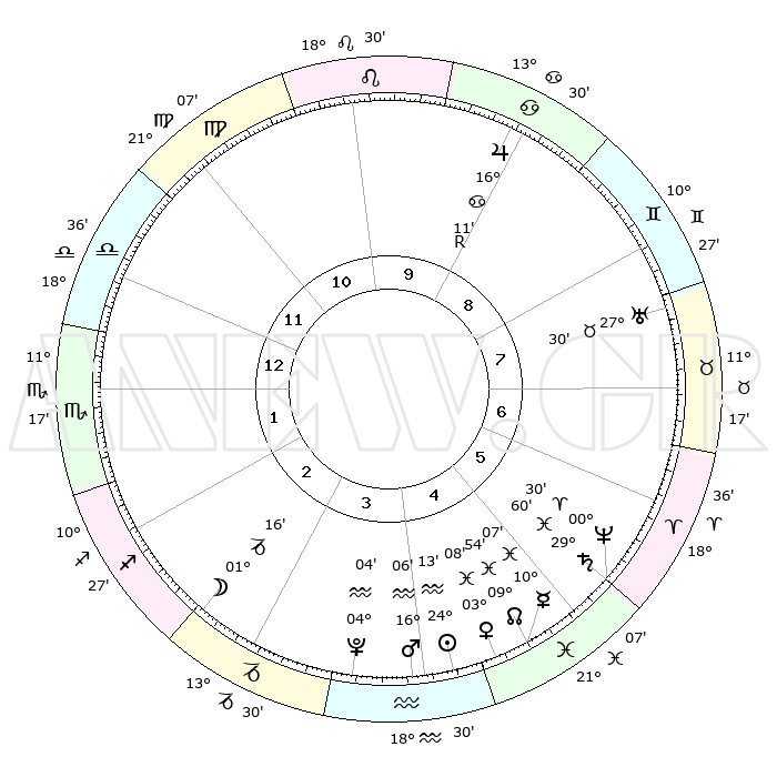 | | ΘΕΣΕΙΣ ΠΛΑΝΗΤΩΝ ΑΣΤΡΟΛΟΓΙΚΟΥ ΧΑΡΤΗ ΤΗΣ ΣΤΙΓΜΗΣ ΑΥΤΗΣ | | | | Πλανήτης | Ζώδιο | Μοίρες | Δεκαήμ. | Σε οίκο | Απόκλιση | | Ακμές των οίκων | | Ηλιος | Υδροχόος | 24°08' | Τρίτο | 4 | 13 S 28 | | 1ος | 19°27' | Ζυγός | | Σελήνη | Αιγόκερως | 00°22' | Πρώτο | 3 | 28 S 20 | | 2ος | 17°16' | Σκορπιός | | Ερμής | Ιχθείς | 09°60' | Πρώτο | 5 | 08 S 11 | | 3ος | 18°31' | Τοξότης | | Αφροδίτη | Ιχθείς | 03°03' | Πρώτο | 5 | 11 S 45 | | 4ος | 22°05' | Αιγόκερως | | Αρης | Υδροχόος | 16°02' | Δεύτερο | 4 | 17 S 03 | | 5ος | 25°02' | Υδροχόος | | Δίας | Καρκίνος | 16°12'R | Δεύτερο | 9 | 22 N 46 | | 6ος | 24°32' | Ιχθείς | | Κρόνος | Ιχθείς | 29°59' | Τρίτο | 6 | 01 S 59 | | 7ος | 19°27' | Κριός | | Ουρανός | Ταύρος | 27°30' | Τρίτο | 8 | 19 N 25 | | 8ος | 17°16' | Ταύρος | | Ποσειδώνας | Κριός | 00°30' | Πρώτο | 6 | 01 S 00 | | 9ος | 18°32' | Δίδυμοι | | Πλούτωνας | Υδροχόος | 04°04' | Πρώτο | 4 | 22 S 57 | | 10ος | 22°05' | Καρκίνος | | Β. Δεσμός | Ιχθείς | 09°54' | Πρώτο | 5 | 07 S 51 | | 11ος | 25°02' | Λέων | | Ωροσκόπος | Ζυγός | 19°27' | Δεύτερο | | | 12ος | 24°32' | Παρθένος | | Μεσουράνημα | Καρκίνος | 22°05' | Τρίτο | | | |