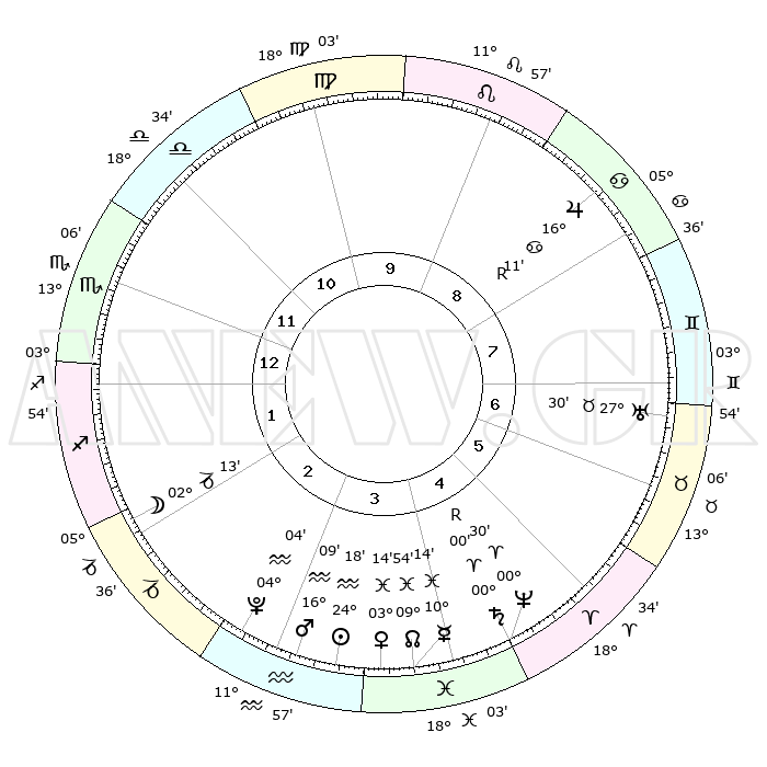 | | ΘΕΣΕΙΣ ΠΛΑΝΗΤΩΝ ΑΣΤΡΟΛΟΓΙΚΟΥ ΧΑΡΤΗ ΤΗΣ ΣΤΙΓΜΗΣ ΑΥΤΗΣ | | | | Πλανήτης | Ζώδιο | Μοίρες | Δεκαήμ. | Σε οίκο | Απόκλιση | | Ακμές των οίκων | | Ηλιος | Υδροχόος | 24°14' | Τρίτο | 4 | 13 S 27 | | 1ος | 14°30' | Σκορπιός | | Σελήνη | Αιγόκερως | 01°24' | Πρώτο | 2 | 28 S 17 | | 2ος | 13°56' | Τοξότης | | Ερμής | Ιχθείς | 10°08' | Δεύτερο | 4 | 08 S 07 | | 3ος | 17°21' | Αιγόκερως | | Αφροδίτη | Ιχθείς | 03°09' | Πρώτο | 4 | 11 S 43 | | 4ος | 22°36' | Υδροχόος | | Αρης | Υδροχόος | 16°06' | Δεύτερο | 3 | 17 S 02 | | 5ος | 25°03' | Ιχθείς | | Δίας | Καρκίνος | 16°11'R | Δεύτερο | 8 | 22 N 46 | | 6ος | 22°09' | Κριός | | Κρόνος | Ιχθείς | 29°60' | Τρίτο | 5 | 01 S 59 | | 7ος | 14°30' | Ταύρος | | Ουρανός | Ταύρος | 27°30' | Τρίτο | 7 | 19 N 25 | | 8ος | 13°56' | Δίδυμοι | | Ποσειδώνας | Κριός | 00°30' | Πρώτο | 5 | 01 S 00 | | 9ος | 17°21' | Καρκίνος | | Πλούτωνας | Υδροχόος | 04°04' | Πρώτο | 3 | 22 S 57 | | 10ος | 22°36' | Λέων | | Β. Δεσμός | Ιχθείς | 09°54' | Πρώτο | 4 | 07 S 51 | | 11ος | 25°03' | Παρθένος | | Ωροσκόπος | Σκορπιός | 14°30' | Δεύτερο | | | 12ος | 22°09' | Ζυγός | | Μεσουράνημα | Λέων | 22°36' | Τρίτο | | | |