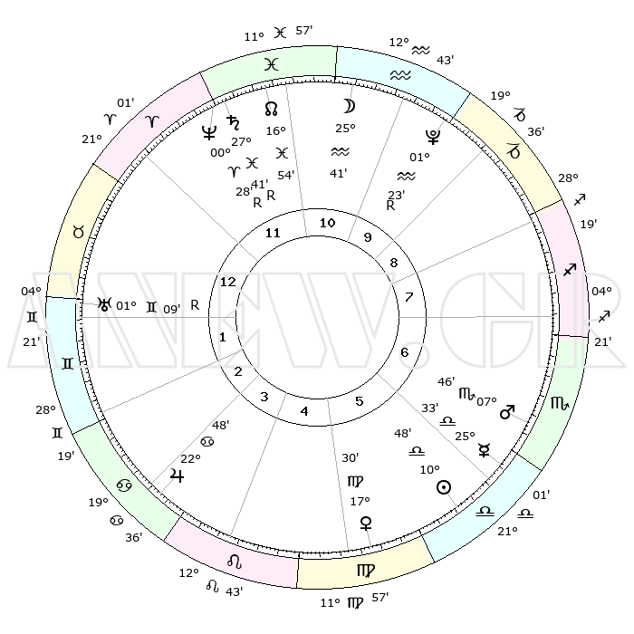 | ΘΕΣΕΙΣ ΠΛΑΝΗΤΩΝ ΑΣΤΡΟΛΟΓΙΚΟΥ ΧΑΡΤΗ ΤΗΣ ΣΤΙΓΜΗΣ ΑΥΤΗΣ | | Πλανήτης | Ζώδιο | Μοίρες | Δεκαήμ. | Σε οίκο | Απόκλιση | | Ακμές των οίκων | Ηλιος | Ζυγός | 10°44' | Δεύτερο | 6 | 04 S 15 | | 1ος | 26°06' | Κριός | Σελήνη | Υδροχόος | 24°36' | Τρίτο | 11 | 15 S 18 | | 2ος | 29°25' | Ταύρος | Ερμής | Ζυγός | 25°25' | Τρίτο | 6 | 10 S 14 | | 3ος | 23°23' | Δίδυμοι | Αφροδίτη | Παρθένος | 17°24' | Δεύτερο | 6 | 06 N 13 | | 4ος | 15°04' | Καρκίνος | Αρης | Σκορπιός | 07°43' | Πρώτο | 7 | 14 S 11 | | 5ος | 09°06' | Λέων | Δίας | Καρκίνος | 22°47' | Τρίτο | 4 | 21 N 32 | | 6ος | 11°03' | Παρθένος | Κρόνος | Ιχθείς | 27°41'R | Τρίτο | 12 | 03 S 14 | | 7ος | 26°06' | Ζυγός | Ουρανός | Δίδυμοι | 01°09'R | Πρώτο | 2 | 20 N 11 | | 8ος | 29°25' | Σκορπιός | Ποσειδώνας | Κριός | 00°28'R | Πρώτο | 12 | 01 S 04 | | 9ος | 23°23' | Τοξότης | Πλούτωνας | Υδροχόος | 01°23'R | Πρώτο | 10 | 23 S 32 | | 10ος | 15°04' | Αιγόκερως | Β. Δεσμός | Ιχθείς | 16°54' | Δεύτερο | 12 | 05 S 10 | | 11ος | 09°06' | Υδροχόος | Ωροσκόπος | Κριός | 26°06' | Τρίτο | | | 12ος | 11°03' | Ιχθείς | Μεσουράνημα | Αιγόκερως | 15°04' | Δεύτερο | | | |