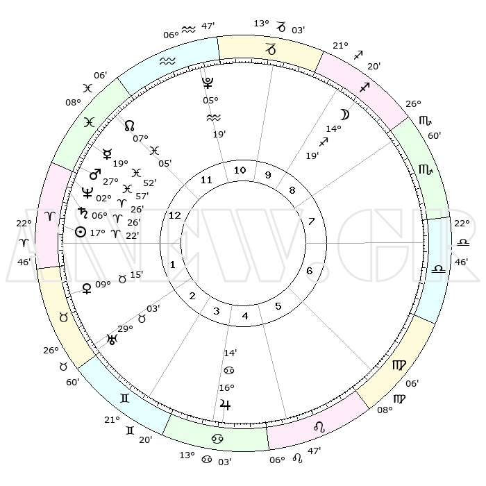 | | ΘΕΣΕΙΣ ΠΛΑΝΗΤΩΝ ΑΣΤΡΟΛΟΓΙΚΟΥ ΧΑΡΤΗ ΤΗΣ ΣΤΙΓΜΗΣ ΑΥΤΗΣ | | | | Πλανήτης | Ζώδιο | Μοίρες | Δεκαήμ. | Σε οίκο | Απόκλιση | | Ακμές των οίκων | | Ηλιος | Κριός | 17°15' | Δεύτερο | 2 | 06 N 46 | | 1ος | 10°46' | Υδροχόος | | Σελήνη | Τοξότης | 12°46' | Δεύτερο | 10 | 27 S 26 | | 2ος | 26°13' | Ιχθείς | | Ερμής | Ιχθείς | 19°43' | Δεύτερο | 1 | 05 S 59 | | 3ος | 02°45' | Ταύρος | | Αφροδίτη | Ταύρος | 09°05' | Πρώτο | 3 | 14 N 21 | | 4ος | 29°30' | Ταύρος | | Αρης | Ιχθείς | 27°51' | Τρίτο | 2 | 01 S 47 | | 5ος | 21°38' | Δίδυμοι | | Δίας | Καρκίνος | 16°14' | Δεύτερο | 6 | 22 N 49 | | 6ος | 13°35' | Καρκίνος | | Κρόνος | Κριός | 06°25' | Πρώτο | 2 | 00 N 35 | | 7ος | 10°46' | Λέων | | Ουρανός | Ταύρος | 29°02' | Τρίτο | 3 | 19 N 46 | | 8ος | 26°13' | Παρθένος | | Ποσειδώνας | Κριός | 02°26' | Πρώτο | 2 | 00 S 14 | | 9ος | 02°45' | Σκορπιός | | Πλούτωνας | Υδροχόος | 05°18' | Πρώτο | 12 | 22 S 47 | | 10ος | 29°30' | Σκορπιός | | Β. Δεσμός | Ιχθείς | 07°05' | Πρώτο | 1 | 08 S 54 | | 11ος | 21°38' | Τοξότης | | Ωροσκόπος | Υδροχόος | 10°46' | Δεύτερο | | | 12ος | 13°35' | Αιγόκερως | | Μεσουράνημα | Σκορπιός | 29°30' | Τρίτο | | | |