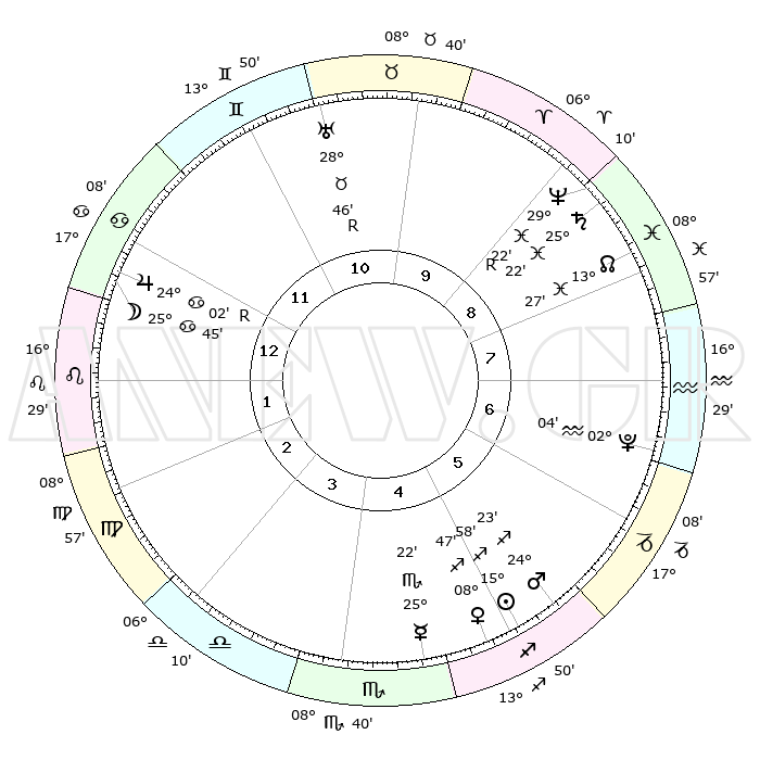 | | ΘΕΣΕΙΣ ΠΛΑΝΗΤΩΝ ΑΣΤΡΟΛΟΓΙΚΟΥ ΧΑΡΤΗ ΤΗΣ ΣΤΙΓΜΗΣ ΑΥΤΗΣ | | | | Πλανήτης | Ζώδιο | Μοίρες | Δεκαήμ. | Σε οίκο | Απόκλιση | | Ακμές των οίκων | | Ηλιος | Τοξότης | 15°36' | Δεύτερο | 9 | 22 S 39 | | 1ος | 22°57' | Ιχθείς | | Σελήνη | Καρκίνος | 20°30' | Τρίτο | 5 | 25 N 49 | | 2ος | 04°52' | Ταύρος | | Ερμής | Σκορπιός | 25°00' | Τρίτο | 8 | 16 S 43 | | 3ος | 03°23' | Δίδυμοι | | Αφροδίτη | Τοξότης | 08°20' | Πρώτο | 9 | 21 S 14 | | 4ος | 26°02' | Δίδυμοι | | Αρης | Τοξότης | 24°07' | Τρίτο | 9 | 24 S 01 | | 5ος | 18°04' | Καρκίνος | | Δίας | Καρκίνος | 24°04'R | Τρίτο | 5 | 21 N 28 | | 6ος | 14°26' | Λέων | | Κρόνος | Ιχθείς | 25°21' | Τρίτο | 1 | 04 S 00 | | 7ος | 22°57' | Παρθένος | | Ουρανός | Ταύρος | 28°47'R | Τρίτο | 2 | 19 N 41 | | 8ος | 04°52' | Σκορπιός | | Ποσειδώνας | Ιχθείς | 29°22'R | Τρίτο | 1 | 01 S 29 | | 9ος | 03°23' | Τοξότης | | Πλούτωνας | Υδροχόος | 02°03' | Πρώτο | 11 | 23 S 22 | | 10ος | 26°02' | Τοξότης | | Β. Δεσμός | Ιχθείς | 13°28' | Δεύτερο | 12 | 06 S 30 | | 11ος | 18°04' | Αιγόκερως | | Ωροσκόπος | Ιχθείς | 22°57' | Τρίτο | | | 12ος | 14°26' | Υδροχόος | | Μεσουράνημα | Τοξότης | 26°02' | Τρίτο | | | |