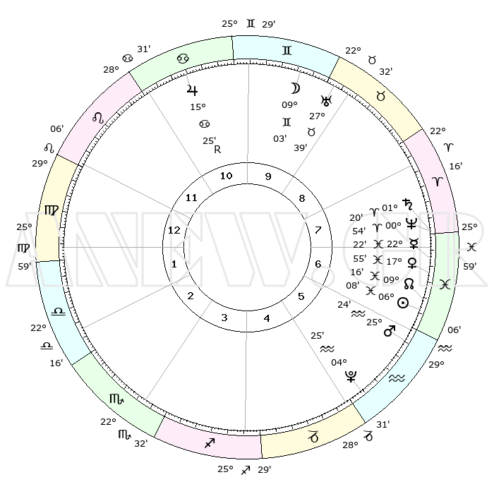| | ΘΕΣΕΙΣ ΠΛΑΝΗΤΩΝ ΑΣΤΡΟΛΟΓΙΚΟΥ ΧΑΡΤΗ ΤΗΣ ΣΤΙΓΜΗΣ ΑΥΤΗΣ | | | | Πλανήτης | Ζώδιο | Μοίρες | Δεκαήμ. | Σε οίκο | Απόκλιση | | Ακμές των οίκων | | Ηλιος | Ιχθείς | 06°04' | Πρώτο | 6 | 09 S 17 | | 1ος | 06°11' | Παρθένος | | Σελήνη | Δίδυμοι | 08°05' | Πρώτο | 10 | 26 N 52 | | 2ος | 00°41' | Ζυγός | | Ερμής | Ιχθείς | 22°21' | Τρίτο | 7 | 00 S 48 | | 3ος | 29°52' | Ζυγός | | Αφροδίτη | Ιχθείς | 17°50' | Δεύτερο | 7 | 06 S 07 | | 4ος | 02°49' | Τοξότης | | Αρης | Υδροχόος | 25°21' | Τρίτο | 6 | 14 S 06 | | 5ος | 06°37' | Αιγόκερως | | Δίας | Καρκίνος | 15°26'R | Δεύτερο | 11 | 22 N 53 | | 6ος | 08°08' | Υδροχόος | | Κρόνος | Κριός | 01°20' | Πρώτο | 8 | 01 S 26 | | 7ος | 06°11' | Ιχθείς | | Ουρανός | Ταύρος | 27°39' | Τρίτο | 9 | 19 N 27 | | 8ος | 00°41' | Κριός | | Ποσειδώνας | Κριός | 00°54' | Πρώτο | 8 | 00 S 51 | | 9ος | 29°52' | Κριός | | Πλούτωνας | Υδροχόος | 04°25' | Πρώτο | 5 | 22 S 54 | | 10ος | 02°49' | Δίδυμοι | | Β. Δεσμός | Ιχθείς | 09°16' | Πρώτο | 7 | 08 S 05 | | 11ος | 06°37' | Καρκίνος | | Ωροσκόπος | Παρθένος | 06°11' | Πρώτο | | | 12ος | 08°08' | Λέων | | Μεσουράνημα | Δίδυμοι | 02°49' | Πρώτο | | | |