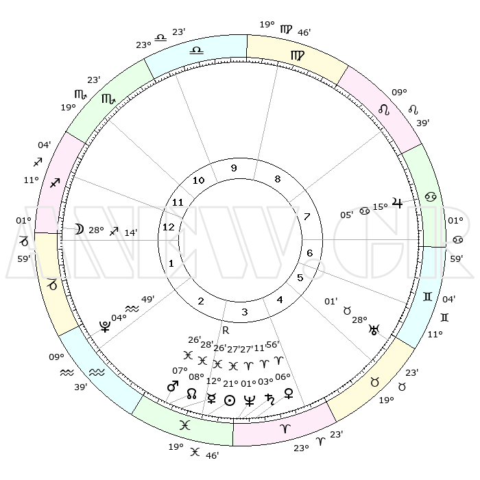 | | ΘΕΣΕΙΣ ΠΛΑΝΗΤΩΝ ΑΣΤΡΟΛΟΓΙΚΟΥ ΧΑΡΤΗ ΤΗΣ ΣΤΙΓΜΗΣ ΑΥΤΗΣ | | | | Πλανήτης | Ζώδιο | Μοίρες | Δεκαήμ. | Σε οίκο | Απόκλιση | | Ακμές των οίκων | | Ηλιος | Ιχθείς | 21°24' | Τρίτο | 3 | 03 S 25 | | 1ος | 16°01' | Τοξότης | | Σελήνη | Τοξότης | 27°38' | Τρίτο | 1 | 28 S 24 | | 2ος | 19°54' | Αιγόκερως | | Ερμής | Ιχθείς | 12°29'R | Δεύτερο | 3 | 04 S 03 | | 3ος | 28°16' | Υδροχόος | | Αφροδίτη | Κριός | 06°53' | Πρώτο | 4 | 01 N 41 | | 4ος | 03°55' | Κριός | | Αρης | Ιχθείς | 07°24' | Πρώτο | 3 | 09 S 48 | | 5ος | 02°33' | Ταύρος | | Δίας | Καρκίνος | 15°05' | Δεύτερο | 7 | 22 N 56 | | 6ος | 25°35' | Ταύρος | | Κρόνος | Κριός | 03°10' | Πρώτο | 3 | 00 S 41 | | 7ος | 16°01' | Δίδυμοι | | Ουρανός | Ταύρος | 28°01' | Τρίτο | 6 | 19 N 32 | | 8ος | 19°54' | Καρκίνος | | Ποσειδώνας | Κριός | 01°27' | Πρώτο | 3 | 00 S 37 | | 9ος | 28°16' | Λέων | | Πλούτωνας | Υδροχόος | 04°49' | Πρώτο | 2 | 22 S 50 | | 10ος | 03°55' | Ζυγός | | Β. Δεσμός | Ιχθείς | 08°28' | Πρώτο | 3 | 08 S 24 | | 11ος | 02°33' | Σκορπιός | | Ωροσκόπος | Τοξότης | 16°01' | Δεύτερο | | | 12ος | 25°35' | Σκορπιός | | Μεσουράνημα | Ζυγός | 03°55' | Πρώτο | | | |