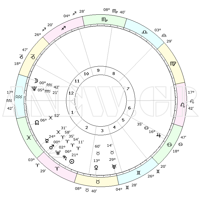 | | ΘΕΣΕΙΣ ΠΛΑΝΗΤΩΝ ΑΣΤΡΟΛΟΓΙΚΟΥ ΧΑΡΤΗ ΤΗΣ ΣΤΙΓΜΗΣ ΑΥΤΗΣ | | | | Πλανήτης | Ζώδιο | Μοίρες | Δεκαήμ. | Σε οίκο | Απόκλιση | | Ακμές των οίκων | | Ηλιος | Κριός | 21°06' | Τρίτο | 3 | 08 N 14 | | 1ος | 13°40' | Αιγόκερως | | Σελήνη | Αιγόκερως | 29°43' | Τρίτο | 1 | 23 S 21 | | 2ος | 24°18' | Υδροχόος | | Ερμής | Ιχθείς | 24°25' | Τρίτο | 2 | 04 S 25 | | 3ος | 04°29' | Κριός | | Αφροδίτη | Ταύρος | 13°54' | Δεύτερο | 4 | 16 N 00 | | 4ος | 05°58' | Ταύρος | | Αρης | Κριός | 00°55' | Πρώτο | 2 | 00 S 33 | | 5ος | 00°20' | Δίδυμοι | | Δίας | Καρκίνος | 16°34' | Δεύτερο | 7 | 22 N 47 | | 6ος | 21°35' | Δίδυμοι | | Κρόνος | Κριός | 06°54' | Πρώτο | 3 | 00 N 46 | | 7ος | 13°40' | Καρκίνος | | Ουρανός | Ταύρος | 29°13' | Τρίτο | 4 | 19 N 49 | | 8ος | 24°18' | Λέων | | Ποσειδώνας | Κριός | 02°35' | Πρώτο | 2 | 00 S 11 | | 9ος | 04°29' | Ζυγός | | Πλούτωνας | Υδροχόος | 05°21' | Πρώτο | 1 | 22 S 47 | | 10ος | 05°58' | Σκορπιός | | Β. Δεσμός | Ιχθείς | 06°53' | Πρώτο | 2 | 08 S 59 | | 11ος | 00°20' | Τοξότης | | Ωροσκόπος | Αιγόκερως | 13°40' | Δεύτερο | | | 12ος | 21°35' | Τοξότης | | Μεσουράνημα | Σκορπιός | 05°58' | Πρώτο | | | |