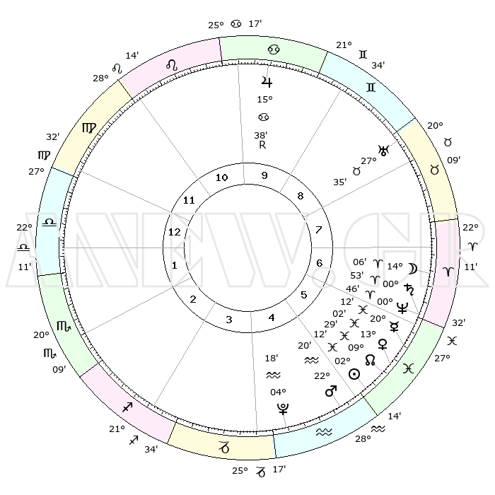 | | ΘΕΣΕΙΣ ΠΛΑΝΗΤΩΝ ΑΣΤΡΟΛΟΓΙΚΟΥ ΧΑΡΤΗ ΤΗΣ ΣΤΙΓΜΗΣ ΑΥΤΗΣ | | | | Πλανήτης | Ζώδιο | Μοίρες | Δεκαήμ. | Σε οίκο | Απόκλιση | | Ακμές των οίκων | | Ηλιος | Ιχθείς | 02°08' | Πρώτο | 5 | 10 S 43 | | 1ος | 29°43' | Παρθένος | | Σελήνη | Κριός | 13°03' | Δεύτερο | 7 | 07 N 53 | | 2ος | 26°17' | Ζυγός | | Ερμής | Ιχθείς | 20°08' | Τρίτο | 6 | 02 S 35 | | 3ος | 26°43' | Σκορπιός | | Αφροδίτη | Ιχθείς | 12°57' | Δεύτερο | 6 | 08 S 02 | | 4ος | 29°41' | Τοξότης | | Αρης | Υδροχόος | 22°16' | Τρίτο | 5 | 15 S 07 | | 5ος | 02°40' | Υδροχόος | | Δίας | Καρκίνος | 15°38'R | Δεύτερο | 10 | 22 N 51 | | 6ος | 03°07' | Ιχθείς | | Κρόνος | Κριός | 00°53' | Πρώτο | 7 | 01 S 37 | | 7ος | 29°43' | Ιχθείς | | Ουρανός | Ταύρος | 27°35' | Τρίτο | 9 | 19 N 26 | | 8ος | 26°17' | Κριός | | Ποσειδώνας | Κριός | 00°46' | Πρώτο | 7 | 00 S 54 | | 9ος | 26°43' | Ταύρος | | Πλούτωνας | Υδροχόος | 04°18' | Πρώτο | 5 | 22 S 55 | | 10ος | 29°41' | Δίδυμοι | | Β. Δεσμός | Ιχθείς | 09°29' | Πρώτο | 6 | 08 S 01 | | 11ος | 02°40' | Λέων | | Ωροσκόπος | Παρθένος | 29°43' | Τρίτο | | | 12ος | 03°07' | Παρθένος | | Μεσουράνημα | Δίδυμοι | 29°41' | Τρίτο | | | |