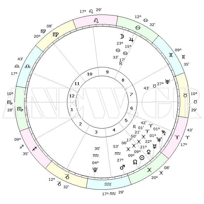 | | ΘΕΣΕΙΣ ΠΛΑΝΗΤΩΝ ΑΣΤΡΟΛΟΓΙΚΟΥ ΧΑΡΤΗ ΤΗΣ ΣΤΙΓΜΗΣ ΑΥΤΗΣ | | | | Πλανήτης | Ζώδιο | Μοίρες | Δεκαήμ. | Σε οίκο | Απόκλιση | | Ακμές των οίκων | | Ηλιος | Ιχθείς | 09°15' | Πρώτο | 5 | 08 S 06 | | 1ος | 27°10' | Ζυγός | | Σελήνη | Καρκίνος | 22°55' | Τρίτο | 9 | 25 N 15 | | 2ος | 25°25' | Σκορπιός | | Ερμής | Ιχθείς | 22°22'R | Τρίτο | 5 | 00 S 11 | | 3ος | 27°09' | Τοξότης | | Αφροδίτη | Ιχθείς | 21°47' | Τρίτο | 5 | 04 S 31 | | 4ος | 01°09' | Υδροχόος | | Αρης | Υδροχόος | 27°50' | Τρίτο | 4 | 13 S 15 | | 5ος | 04°06' | Ιχθείς | | Δίας | Καρκίνος | 15°18'R | Δεύτερο | 9 | 22 N 54 | | 6ος | 03°01' | Κριός | | Κρόνος | Κριός | 01°42' | Πρώτο | 5 | 01 S 17 | | 7ος | 27°10' | Κριός | | Ουρανός | Ταύρος | 27°42' | Τρίτο | 8 | 19 N 28 | | 8ος | 25°25' | Ταύρος | | Ποσειδώνας | Κριός | 01°00' | Πρώτο | 5 | 00 S 48 | | 9ος | 27°09' | Δίδυμοι | | Πλούτωνας | Υδροχόος | 04°30' | Πρώτο | 4 | 22 S 53 | | 10ος | 01°09' | Λέων | | Β. Δεσμός | Ιχθείς | 09°06' | Πρώτο | 5 | 08 S 09 | | 11ος | 04°06' | Παρθένος | | Ωροσκόπος | Ζυγός | 27°10' | Τρίτο | | | 12ος | 03°01' | Ζυγός | | Μεσουράνημα | Λέων | 01°09' | Πρώτο | | | |
