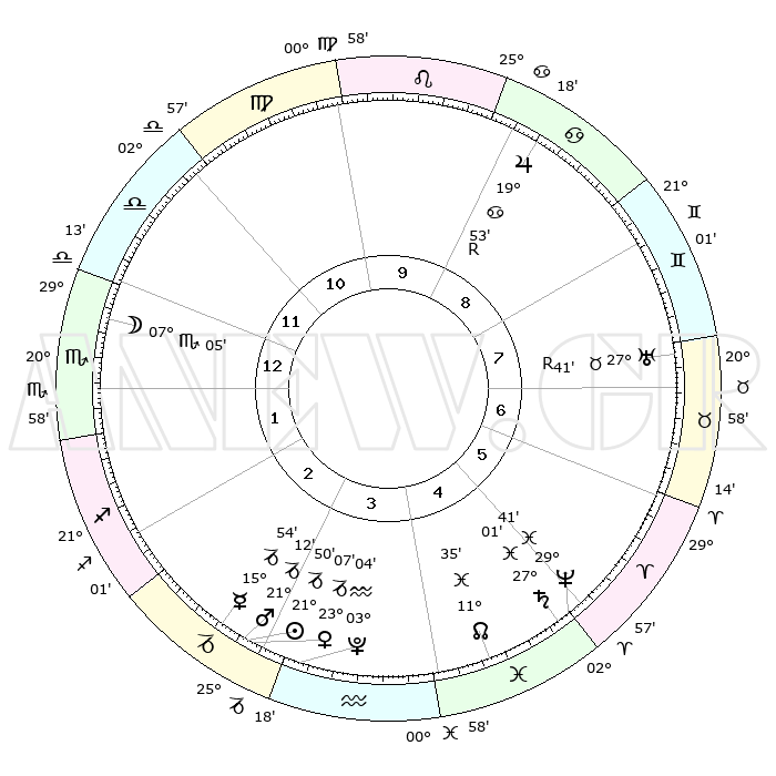 | | ΘΕΣΕΙΣ ΠΛΑΝΗΤΩΝ ΑΣΤΡΟΛΟΓΙΚΟΥ ΧΑΡΤΗ ΤΗΣ ΣΤΙΓΜΗΣ ΑΥΤΗΣ | | | | Πλανήτης | Ζώδιο | Μοίρες | Δεκαήμ. | Σε οίκο | Απόκλιση | | Ακμές των οίκων | | Ηλιος | Αιγόκερως | 21°44' | Τρίτο | 3 | 21 S 41 | | 1ος | 24°10' | Ζυγός | | Σελήνη | Σκορπιός | 05°59' | Πρώτο | 1 | 17 S 30 | | 2ος | 22°14' | Σκορπιός | | Ερμής | Αιγόκερως | 15°45' | Δεύτερο | 3 | 24 S 05 | | 3ος | 23°47' | Τοξότης | | Αφροδίτη | Αιγόκερως | 23°00' | Τρίτο | 3 | 22 S 21 | | 4ος | 27°36' | Αιγόκερως | | Αρης | Αιγόκερως | 21°08' | Τρίτο | 3 | 22 S 43 | | 5ος | 00°33' | Ιχθείς | | Δίας | Καρκίνος | 19°53'R | Δεύτερο | 9 | 22 N 13 | | 6ος | 29°42' | Ιχθείς | | Κρόνος | Ιχθείς | 27°01' | Τρίτο | 5 | 03 S 14 | | 7ος | 24°10' | Κριός | | Ουρανός | Ταύρος | 27°41'R | Τρίτο | 8 | 19 N 27 | | 8ος | 22°14' | Ταύρος | | Ποσειδώνας | Ιχθείς | 29°41' | Τρίτο | 5 | 01 S 21 | | 9ος | 23°47' | Δίδυμοι | | Πλούτωνας | Υδροχόος | 03°04' | Πρώτο | 4 | 23 S 09 | | 10ος | 27°36' | Καρκίνος | | Β. Δεσμός | Ιχθείς | 11°35' | Δεύτερο | 5 | 07 S 13 | | 11ος | 00°33' | Παρθένος | | Ωροσκόπος | Ζυγός | 24°10' | Τρίτο | | | 12ος | 29°42' | Παρθένος | | Μεσουράνημα | Καρκίνος | 27°36' | Τρίτο | | | |