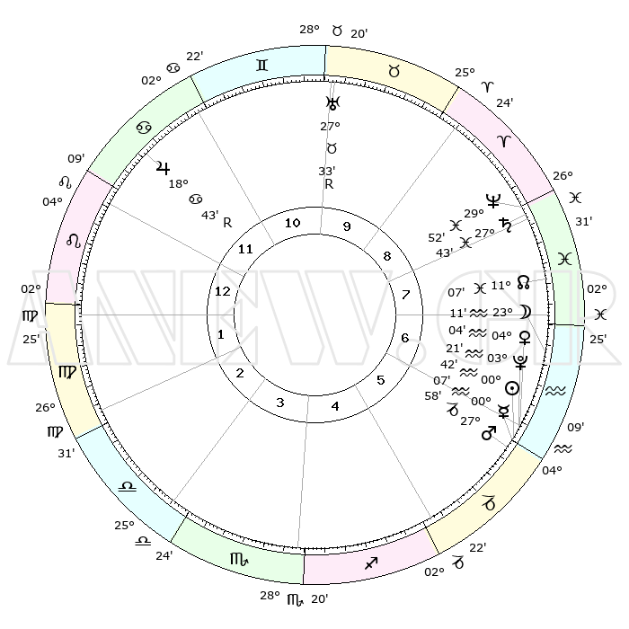 | | ΘΕΣΕΙΣ ΠΛΑΝΗΤΩΝ ΑΣΤΡΟΛΟΓΙΚΟΥ ΧΑΡΤΗ ΤΗΣ ΣΤΙΓΜΗΣ ΑΥΤΗΣ | | | | Πλανήτης | Ζώδιο | Μοίρες | Δεκαήμ. | Σε οίκο | Απόκλιση | | Ακμές των οίκων | | Ηλιος | Υδροχόος | 00°36' | Πρώτο | 6 | 20 S 01 | | 1ος | 05°50' | Λέων | | Σελήνη | Υδροχόος | 22°01' | Τρίτο | 7 | 15 S 38 | | 2ος | 27°18' | Λέων | | Ερμής | Αιγόκερως | 29°58' | Τρίτο | 6 | 22 S 08 | | 3ος | 23°09' | Παρθένος | | Αφροδίτη | Υδροχόος | 03°57' | Πρώτο | 6 | 20 S 22 | | 4ος | 24°50' | Ζυγός | | Αρης | Αιγόκερως | 27°53' | Τρίτο | 6 | 21 S 33 | | 5ος | 00°40' | Τοξότης | | Δίας | Καρκίνος | 18°44'R | Δεύτερο | 12 | 22 N 24 | | 6ος | 05°26' | Αιγόκερως | | Κρόνος | Ιχθείς | 27°43' | Τρίτο | 9 | 02 S 56 | | 7ος | 05°50' | Υδροχόος | | Ουρανός | Ταύρος | 27°33'R | Τρίτο | 10 | 19 N 25 | | 8ος | 27°18' | Υδροχόος | | Ποσειδώνας | Ιχθείς | 29°51' | Τρίτο | 9 | 01 S 16 | | 9ος | 23°09' | Ιχθείς | | Πλούτωνας | Υδροχόος | 03°20' | Πρώτο | 6 | 23 S 06 | | 10ος | 24°50' | Κριός | | Β. Δεσμός | Ιχθείς | 11°08' | Δεύτερο | 8 | 07 S 23 | | 11ος | 00°40' | Δίδυμοι | | Ωροσκόπος | Λέων | 05°50' | Πρώτο | | | 12ος | 05°26' | Καρκίνος | | Μεσουράνημα | Κριός | 24°50' | Τρίτο | | | |
