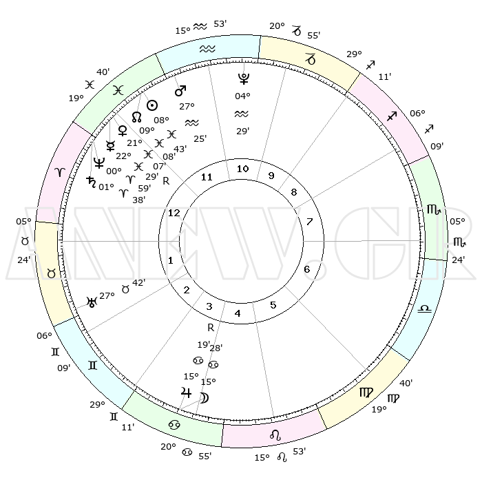 | | ΘΕΣΕΙΣ ΠΛΑΝΗΤΩΝ ΑΣΤΡΟΛΟΓΙΚΟΥ ΧΑΡΤΗ ΤΗΣ ΣΤΙΓΜΗΣ ΑΥΤΗΣ | | | | Πλανήτης | Ζώδιο | Μοίρες | Δεκαήμ. | Σε οίκο | Απόκλιση | | Ακμές των οίκων | | Ηλιος | Ιχθείς | 08°39' | Πρώτο | 12 | 08 S 20 | | 1ος | 28°26' | Ιχθείς | | Σελήνη | Καρκίνος | 14°33' | Δεύτερο | 4 | 26 N 55 | | 2ος | 09°06' | Ταύρος | | Ερμής | Ιχθείς | 22°29'R | Τρίτο | 12 | 00 S 14 | | 3ος | 06°45' | Δίδυμοι | | Αφροδίτη | Ιχθείς | 21°02' | Τρίτο | 12 | 04 S 49 | | 4ος | 29°07' | Δίδυμοι | | Αρης | Υδροχόος | 27°22' | Τρίτο | 12 | 13 S 25 | | 5ος | 21°22' | Καρκίνος | | Δίας | Καρκίνος | 15°19'R | Δεύτερο | 4 | 22 N 54 | | 6ος | 18°32' | Λέων | | Κρόνος | Κριός | 01°38' | Πρώτο | 1 | 01 S 19 | | 7ος | 28°26' | Παρθένος | | Ουρανός | Ταύρος | 27°42' | Τρίτο | 2 | 19 N 28 | | 8ος | 09°06' | Σκορπιός | | Ποσειδώνας | Κριός | 00°59' | Πρώτο | 1 | 00 S 48 | | 9ος | 06°45' | Τοξότης | | Πλούτωνας | Υδροχόος | 04°29' | Πρώτο | 11 | 22 S 53 | | 10ος | 29°07' | Τοξότης | | Β. Δεσμός | Ιχθείς | 09°08' | Πρώτο | 12 | 08 S 08 | | 11ος | 21°22' | Αιγόκερως | | Ωροσκόπος | Ιχθείς | 28°26' | Τρίτο | | | 12ος | 18°32' | Υδροχόος | | Μεσουράνημα | Τοξότης | 29°07' | Τρίτο | | | |