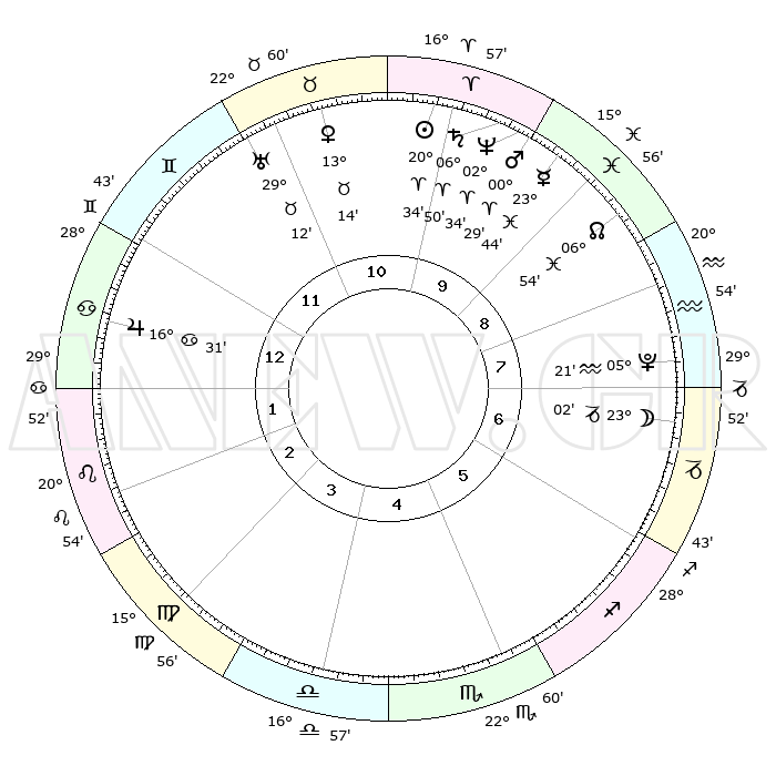| | ΘΕΣΕΙΣ ΠΛΑΝΗΤΩΝ ΑΣΤΡΟΛΟΓΙΚΟΥ ΧΑΡΤΗ ΤΗΣ ΣΤΙΓΜΗΣ ΑΥΤΗΣ | | | | Πλανήτης | Ζώδιο | Μοίρες | Δεκαήμ. | Σε οίκο | Απόκλιση | | Ακμές των οίκων | | Ηλιος | Κριός | 20°30' | Τρίτο | 10 | 08 N 00 | | 1ος | 11°07' | Καρκίνος | | Σελήνη | Αιγόκερως | 22°17' | Τρίτο | 7 | 25 S 15 | | 2ος | 01°33' | Λέων | | Ερμής | Ιχθείς | 23°39' | Τρίτο | 10 | 04 S 41 | | 3ος | 24°17' | Λέων | | Αφροδίτη | Ταύρος | 13°09' | Δεύτερο | 11 | 15 N 45 | | 4ος | 22°27' | Παρθένος | | Αρης | Κριός | 00°26' | Πρώτο | 10 | 00 S 45 | | 5ος | 27°50' | Ζυγός | | Δίας | Καρκίνος | 16°31' | Δεύτερο | 1 | 22 N 47 | | 6ος | 06°37' | Τοξότης | | Κρόνος | Κριός | 06°49' | Πρώτο | 10 | 00 N 45 | | 7ος | 11°07' | Αιγόκερως | | Ουρανός | Ταύρος | 29°12' | Τρίτο | 11 | 19 N 48 | | 8ος | 01°33' | Υδροχόος | | Ποσειδώνας | Κριός | 02°33' | Πρώτο | 10 | 00 S 11 | | 9ος | 24°17' | Υδροχόος | | Πλούτωνας | Υδροχόος | 05°21' | Πρώτο | 8 | 22 S 47 | | 10ος | 22°27' | Ιχθείς | | Β. Δεσμός | Ιχθείς | 06°54' | Πρώτο | 9 | 08 S 58 | | 11ος | 27°50' | Κριός | | Ωροσκόπος | Καρκίνος | 11°07' | Δεύτερο | | | 12ος | 06°37' | Δίδυμοι | | Μεσουράνημα | Ιχθείς | 22°27' | Τρίτο | | | |