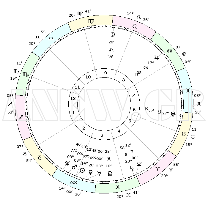 | | ΘΕΣΕΙΣ ΠΛΑΝΗΤΩΝ ΑΣΤΡΟΛΟΓΙΚΟΥ ΧΑΡΤΗ ΤΗΣ ΣΤΙΓΜΗΣ ΑΥΤΗΣ | | | | Πλανήτης | Ζώδιο | Μοίρες | Δεκαήμ. | Σε οίκο | Απόκλιση | | Ακμές των οίκων | | Ηλιος | Υδροχόος | 14°09' | Δεύτερο | 3 | 16 S 35 | | 1ος | 21°28' | Σκορπιός | | Σελήνη | Λέων | 27°58' | Τρίτο | 9 | 13 N 08 | | 2ος | 21°34' | Τοξότης | | Ερμής | Υδροχόος | 23°01' | Τρίτο | 3 | 15 S 29 | | 3ος | 25°56' | Αιγόκερως | | Αφροδίτη | Υδροχόος | 20°41' | Τρίτο | 3 | 15 S 55 | | 4ος | 01°38' | Ιχθείς | | Αρης | Υδροχόος | 08°18' | Πρώτο | 3 | 19 S 12 | | 5ος | 03°34' | Κριός | | Δίας | Καρκίνος | 17°08'R | Δεύτερο | 8 | 22 N 38 | | 6ος | 29°46' | Κριός | | Κρόνος | Ιχθείς | 28°57' | Τρίτο | 4 | 02 S 24 | | 7ος | 21°28' | Ταύρος | | Ουρανός | Ταύρος | 27°27'R | Τρίτο | 7 | 19 N 24 | | 8ος | 21°34' | Δίδυμοι | | Ποσειδώνας | Κριός | 00°12' | Πρώτο | 4 | 01 S 08 | | 9ος | 25°56' | Καρκίνος | | Πλούτωνας | Υδροχόος | 03°46' | Πρώτο | 3 | 23 S 01 | | 10ος | 01°38' | Παρθένος | | Β. Δεσμός | Ιχθείς | 10°25' | Δεύτερο | 4 | 07 S 39 | | 11ος | 03°34' | Ζυγός | | Ωροσκόπος | Σκορπιός | 21°28' | Τρίτο | | | 12ος | 29°46' | Ζυγός | | Μεσουράνημα | Παρθένος | 01°38' | Πρώτο | | | |