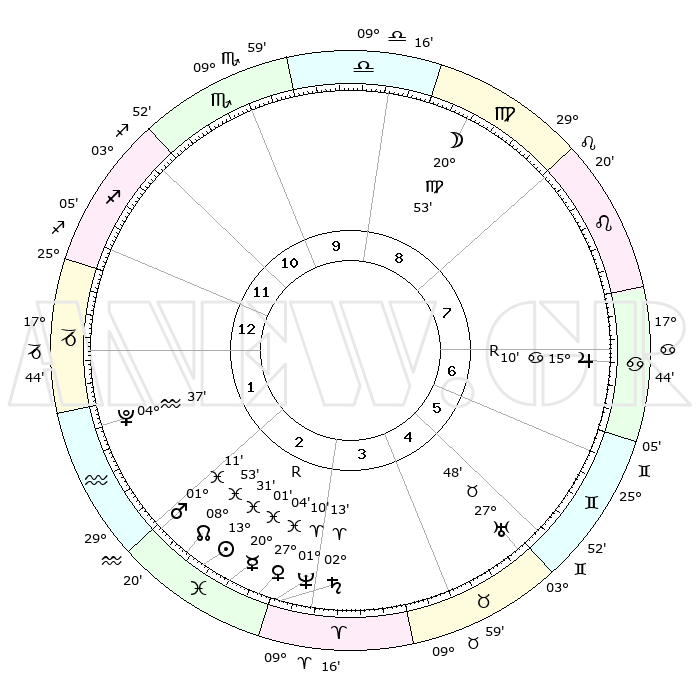 | | ΘΕΣΕΙΣ ΠΛΑΝΗΤΩΝ ΑΣΤΡΟΛΟΓΙΚΟΥ ΧΑΡΤΗ ΤΗΣ ΣΤΙΓΜΗΣ ΑΥΤΗΣ | | | | Πλανήτης | Ζώδιο | Μοίρες | Δεκαήμ. | Σε οίκο | Απόκλιση | | Ακμές των οίκων | | Ηλιος | Ιχθείς | 13°27' | Δεύτερο | 2 | 06 S 30 | | 1ος | 28°12' | Τοξότης | | Σελήνη | Παρθένος | 20°09' | Τρίτο | 9 | 02 N 57 | | 2ος | 04°54' | Υδροχόος | | Ερμής | Ιχθείς | 20°04'R | Τρίτο | 3 | 00 S 36 | | 3ος | 14°46' | Ιχθείς | | Αφροδίτη | Ιχθείς | 27°00' | Τρίτο | 3 | 02 S 23 | | 4ος | 18°59' | Κριός | | Αρης | Ιχθείς | 01°09' | Πρώτο | 2 | 12 S 05 | | 5ος | 15°35' | Ταύρος | | Δίας | Καρκίνος | 15°10'R | Δεύτερο | 7 | 22 N 55 | | 6ος | 07°31' | Δίδυμοι | | Κρόνος | Κριός | 02°12' | Πρώτο | 3 | 01 S 05 | | 7ος | 28°12' | Δίδυμοι | | Ουρανός | Ταύρος | 27°48' | Τρίτο | 5 | 19 N 29 | | 8ος | 04°54' | Λέων | | Ποσειδώνας | Κριός | 01°10' | Πρώτο | 3 | 00 S 44 | | 9ος | 14°46' | Παρθένος | | Πλούτωνας | Υδροχόος | 04°37' | Πρώτο | 1 | 22 S 52 | | 10ος | 18°59' | Ζυγός | | Β. Δεσμός | Ιχθείς | 08°53' | Πρώτο | 2 | 08 S 14 | | 11ος | 15°35' | Σκορπιός | | Ωροσκόπος | Τοξότης | 28°12' | Τρίτο | | | 12ος | 07°31' | Τοξότης | | Μεσουράνημα | Ζυγός | 18°59' | Δεύτερο | | | |