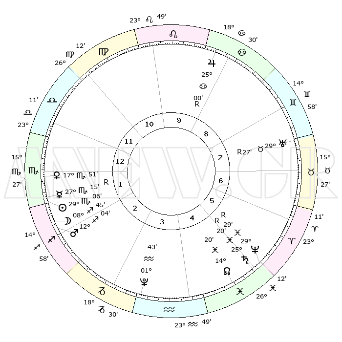 | | ΘΕΣΕΙΣ ΠΛΑΝΗΤΩΝ ΑΣΤΡΟΛΟΓΙΚΟΥ ΧΑΡΤΗ ΤΗΣ ΣΤΙΓΜΗΣ ΑΥΤΗΣ | | | | Πλανήτης | Ζώδιο | Μοίρες | Δεκαήμ. | Σε οίκο | Απόκλιση | | Ακμές των οίκων | | Ηλιος | Σκορπιός | 29°03' | Τρίτο | 1 | 19 S 56 | | 1ος | 01°58' | Σκορπιός | | Σελήνη | Τοξότης | 08°12' | Πρώτο | 2 | 26 S 34 | | 2ος | 00°30' | Τοξότης | | Ερμής | Σκορπιός | 27°19'R | Τρίτο | 1 | 18 S 47 | | 3ος | 02°37' | Αιγόκερως | | Αφροδίτη | Σκορπιός | 17°48' | Δεύτερο | 1 | 16 S 08 | | 4ος | 06°56' | Υδροχόος | | Αρης | Τοξότης | 12°02' | Δεύτερο | 2 | 22 S 48 | | 5ος | 09°50' | Ιχθείς | | Δίας | Καρκίνος | 25°00'R | Τρίτο | 9 | 21 N 15 | | 6ος | 08°19' | Κριός | | Κρόνος | Ιχθείς | 25°20'R | Τρίτο | 5 | 04 S 04 | | 7ος | 01°58' | Ταύρος | | Ουρανός | Ταύρος | 29°27'R | Τρίτο | 7 | 19 N 50 | | 8ος | 00°30' | Δίδυμοι | | Ποσειδώνας | Ιχθείς | 29°29'R | Τρίτο | 5 | 01 S 27 | | 9ος | 02°37' | Καρκίνος | | Πλούτωνας | Υδροχόος | 01°43' | Πρώτο | 3 | 23 S 27 | | 10ος | 06°56' | Λέων | | Β. Δεσμός | Ιχθείς | 14°20' | Δεύτερο | 5 | 06 S 10 | | 11ος | 09°50' | Παρθένος | | Ωροσκόπος | Σκορπιός | 01°58' | Πρώτο | | | 12ος | 08°19' | Ζυγός | | Μεσουράνημα | Λέων | 06°56' | Πρώτο | | | |