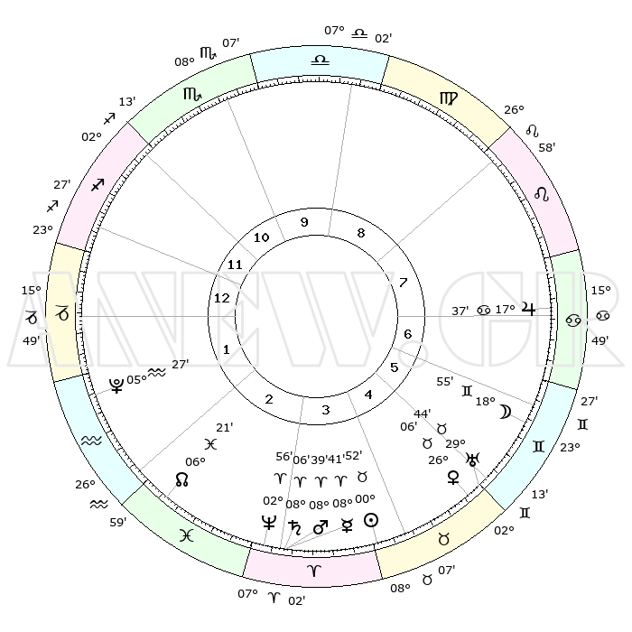 | | ΘΕΣΕΙΣ ΠΛΑΝΗΤΩΝ ΑΣΤΡΟΛΟΓΙΚΟΥ ΧΑΡΤΗ ΤΗΣ ΣΤΙΓΜΗΣ ΑΥΤΗΣ | | | | Πλανήτης | Ζώδιο | Μοίρες | Δεκαήμ. | Σε οίκο | Απόκλιση | | Ακμές των οίκων | | Ηλιος | Ταύρος | 00°48' | Πρώτο | 4 | 11 N 45 | | 1ος | 22°20' | Τοξότης | | Σελήνη | Δίδυμοι | 17°54' | Δεύτερο | 6 | 27 N 53 | | 2ος | 27°37' | Αιγόκερως | | Ερμής | Κριός | 08°35' | Πρώτο | 3 | 01 N 00 | | 3ος | 06°52' | Ιχθείς | | Αφροδίτη | Ταύρος | 26°01' | Τρίτο | 5 | 19 N 41 | | 4ος | 11°53' | Κριός | | Αρης | Κριός | 08°36' | Πρώτο | 3 | 02 N 32 | | 5ος | 09°28' | Ταύρος | | Δίας | Καρκίνος | 17°37' | Δεύτερο | 7 | 22 N 39 | | 6ος | 01°52' | Δίδυμοι | | Κρόνος | Κριός | 08°05' | Πρώτο | 3 | 01 N 14 | | 7ος | 22°20' | Δίδυμοι | | Ουρανός | Ταύρος | 29°44' | Τρίτο | 5 | 19 N 55 | | 8ος | 27°37' | Καρκίνος | | Ποσειδώνας | Κριός | 02°56' | Πρώτο | 3 | 00 S 03 | | 9ος | 06°52' | Παρθένος | | Πλούτωνας | Υδροχόος | 05°27' | Πρώτο | 2 | 22 S 48 | | 10ος | 11°53' | Ζυγός | | Β. Δεσμός | Ιχθείς | 06°21' | Πρώτο | 2 | 09 S 11 | | 11ος | 09°28' | Σκορπιός | | Ωροσκόπος | Τοξότης | 22°20' | Τρίτο | | | 12ος | 01°52' | Τοξότης | | Μεσουράνημα | Ζυγός | 11°53' | Δεύτερο | | | |