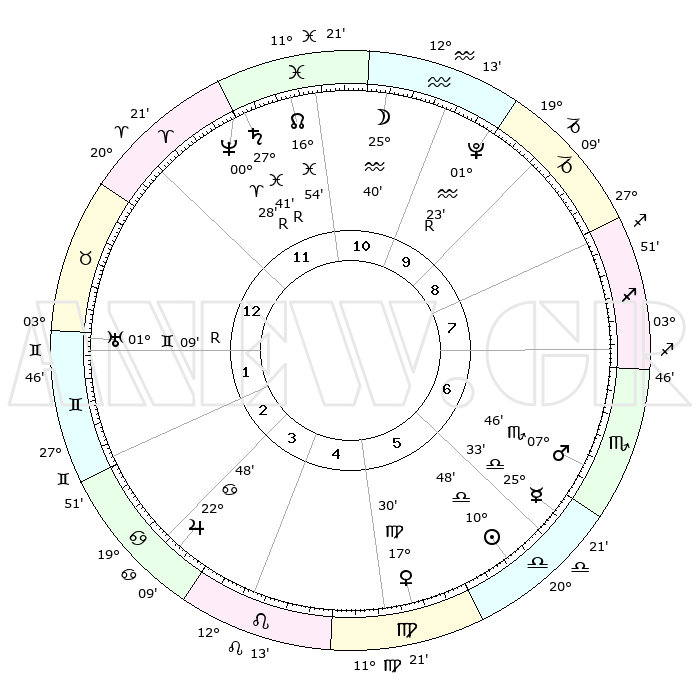 | ΘΕΣΕΙΣ ΠΛΑΝΗΤΩΝ ΑΣΤΡΟΛΟΓΙΚΟΥ ΧΑΡΤΗ ΤΗΣ ΣΤΙΓΜΗΣ ΑΥΤΗΣ | | Πλανήτης | Ζώδιο | Μοίρες | Δεκαήμ. | Σε οίκο | Απόκλιση | | Ακμές των οίκων | Ηλιος | Ζυγός | 10°44' | Δεύτερο | 6 | 04 S 15 | | 1ος | 26°06' | Κριός | Σελήνη | Υδροχόος | 24°36' | Τρίτο | 11 | 15 S 18 | | 2ος | 29°25' | Ταύρος | Ερμής | Ζυγός | 25°25' | Τρίτο | 6 | 10 S 14 | | 3ος | 23°23' | Δίδυμοι | Αφροδίτη | Παρθένος | 17°24' | Δεύτερο | 6 | 06 N 13 | | 4ος | 15°04' | Καρκίνος | Αρης | Σκορπιός | 07°43' | Πρώτο | 7 | 14 S 11 | | 5ος | 09°06' | Λέων | Δίας | Καρκίνος | 22°47' | Τρίτο | 4 | 21 N 32 | | 6ος | 11°03' | Παρθένος | Κρόνος | Ιχθείς | 27°41'R | Τρίτο | 12 | 03 S 14 | | 7ος | 26°06' | Ζυγός | Ουρανός | Δίδυμοι | 01°09'R | Πρώτο | 2 | 20 N 11 | | 8ος | 29°25' | Σκορπιός | Ποσειδώνας | Κριός | 00°28'R | Πρώτο | 12 | 01 S 04 | | 9ος | 23°23' | Τοξότης | Πλούτωνας | Υδροχόος | 01°23'R | Πρώτο | 10 | 23 S 32 | | 10ος | 15°04' | Αιγόκερως | Β. Δεσμός | Ιχθείς | 16°54' | Δεύτερο | 12 | 05 S 10 | | 11ος | 09°06' | Υδροχόος | Ωροσκόπος | Κριός | 26°06' | Τρίτο | | | 12ος | 11°03' | Ιχθείς | Μεσουράνημα | Αιγόκερως | 15°04' | Δεύτερο | | | |