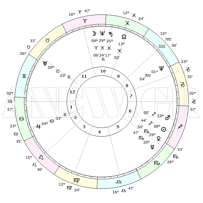 | | ΘΕΣΕΙΣ ΠΛΑΝΗΤΩΝ ΑΣΤΡΟΛΟΓΙΚΟΥ ΧΑΡΤΗ ΤΗΣ ΣΤΙΓΜΗΣ ΑΥΤΗΣ | | | | Πλανήτης | Ζώδιο | Μοίρες | Δεκαήμ. | Σε οίκο | Απόκλιση | | Ακμές των οίκων | | Ηλιος | Τοξότης | 08°42' | Πρώτο | 6 | 21 S 45 | | 1ος | 21°27' | Δίδυμοι | | Σελήνη | Κριός | 08°37' | Πρώτο | 11 | 05 N 19 | | 2ος | 12°57' | Καρκίνος | | Ερμής | Σκορπιός | 20°47' | Τρίτο | 6 | 15 S 27 | | 3ος | 04°20' | Λέων | | Αφροδίτη | Σκορπιός | 29°47' | Τρίτο | 6 | 19 S 24 | | 4ος | 29°22' | Λέων | | Αρης | Τοξότης | 19°03' | Δεύτερο | 6 | 23 S 38 | | 5ος | 01°49' | Ζυγός | | Δίας | Καρκίνος | 24°33'R | Τρίτο | 2 | 21 N 22 | | 6ος | 12°07' | Σκορπιός | | Κρόνος | Ιχθείς | 25°17' | Τρίτο | 10 | 04 S 03 | | 7ος | 21°27' | Τοξότης | | Ουρανός | Ταύρος | 29°04'R | Τρίτο | 12 | 19 N 45 | | 8ος | 12°57' | Αιγόκερως | | Ποσειδώνας | Ιχθείς | 29°24'R | Τρίτο | 10 | 01 S 29 | | 9ος | 04°20' | Υδροχόος | | Πλούτωνας | Υδροχόος | 01°54' | Πρώτο | 8 | 23 S 24 | | 10ος | 29°22' | Υδροχόος | | Β. Δεσμός | Ιχθείς | 13°50' | Δεύτερο | 10 | 06 S 22 | | 11ος | 01°49' | Κριός | | Ωροσκόπος | Δίδυμοι | 21°27' | Τρίτο | | | 12ος | 12°07' | Ταύρος | | Μεσουράνημα | Υδροχόος | 29°22' | Τρίτο | | | |