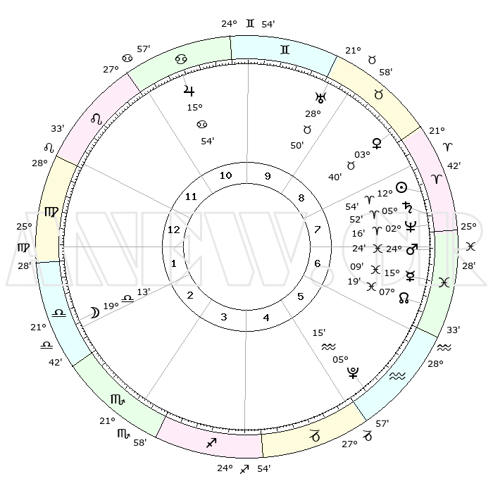 | | ΘΕΣΕΙΣ ΠΛΑΝΗΤΩΝ ΑΣΤΡΟΛΟΓΙΚΟΥ ΧΑΡΤΗ ΤΗΣ ΣΤΙΓΜΗΣ ΑΥΤΗΣ | | | | Πλανήτης | Ζώδιο | Μοίρες | Δεκαήμ. | Σε οίκο | Απόκλιση | | Ακμές των οίκων | | Ηλιος | Κριός | 12°49' | Δεύτερο | 8 | 05 N 04 | | 1ος | 02°38' | Παρθένος | | Σελήνη | Ζυγός | 18°15' | Δεύτερο | 2 | 10 S 12 | | 2ος | 26°46' | Παρθένος | | Ερμής | Ιχθείς | 15°05' | Δεύτερο | 7 | 07 S 18 | | 3ος | 25°40' | Ζυγός | | Αφροδίτη | Ταύρος | 03°34' | Πρώτο | 9 | 12 N 21 | | 4ος | 28°36' | Σκορπιός | | Αρης | Ιχθείς | 24°21' | Τρίτο | 7 | 03 S 12 | | 5ος | 02°37' | Αιγόκερως | | Δίας | Καρκίνος | 15°53' | Δεύτερο | 11 | 22 N 51 | | 6ος | 04°23' | Υδροχόος | | Κρόνος | Κριός | 05°51' | Πρώτο | 8 | 00 N 22 | | 7ος | 02°38' | Ιχθείς | | Ουρανός | Ταύρος | 28°50' | Τρίτο | 10 | 19 N 44 | | 8ος | 26°46' | Ιχθείς | | Ποσειδώνας | Κριός | 02°16' | Πρώτο | 8 | 00 S 18 | | 9ος | 25°40' | Κριός | | Πλούτωνας | Υδροχόος | 05°15' | Πρώτο | 6 | 22 S 47 | | 10ος | 28°36' | Ταύρος | | Β. Δεσμός | Ιχθείς | 07°19' | Πρώτο | 7 | 08 S 49 | | 11ος | 02°37' | Καρκίνος | | Ωροσκόπος | Παρθένος | 02°38' | Πρώτο | | | 12ος | 04°23' | Λέων | | Μεσουράνημα | Ταύρος | 28°36' | Τρίτο | | | |