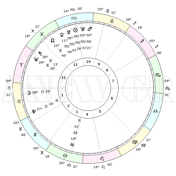 | | ΘΕΣΕΙΣ ΠΛΑΝΗΤΩΝ ΑΣΤΡΟΛΟΓΙΚΟΥ ΧΑΡΤΗ ΤΗΣ ΣΤΙΓΜΗΣ ΑΥΤΗΣ | | | | Πλανήτης | Ζώδιο | Μοίρες | Δεκαήμ. | Σε οίκο | Απόκλιση | | Ακμές των οίκων | | Ηλιος | Υδροχόος | 06°22' | Πρώτο | 11 | 18 S 41 | | 1ος | 24°01' | Ιχθείς | | Σελήνη | Ταύρος | 07°59' | Πρώτο | 2 | 18 N 22 | | 2ος | 05°41' | Ταύρος | | Ερμής | Υδροχόος | 09°34' | Πρώτο | 11 | 19 S 51 | | 3ος | 04°02' | Δίδυμοι | | Αφροδίτη | Υδροχόος | 11°04' | Δεύτερο | 11 | 18 S 40 | | 4ος | 26°38' | Δίδυμοι | | Αρης | Υδροχόος | 02°18' | Πρώτο | 11 | 20 S 38 | | 5ος | 18°42' | Καρκίνος | | Δίας | Καρκίνος | 18°01'R | Δεύτερο | 4 | 22 N 31 | | 6ος | 15°13' | Λέων | | Κρόνος | Ιχθείς | 28°13' | Τρίτο | 1 | 02 S 43 | | 7ος | 24°01' | Παρθένος | | Ουρανός | Ταύρος | 27°29'R | Τρίτο | 2 | 19 N 25 | | 8ος | 05°41' | Σκορπιός | | Ποσειδώνας | Ιχθείς | 29°60' | Τρίτο | 1 | 01 S 13 | | 9ος | 04°02' | Τοξότης | | Πλούτωνας | Υδροχόος | 03°31' | Πρώτο | 11 | 23 S 03 | | 10ος | 26°38' | Τοξότης | | Β. Δεσμός | Ιχθείς | 10°50' | Δεύτερο | 12 | 07 S 30 | | 11ος | 18°42' | Αιγόκερως | | Ωροσκόπος | Ιχθείς | 24°01' | Τρίτο | | | 12ος | 15°13' | Υδροχόος | | Μεσουράνημα | Τοξότης | 26°38' | Τρίτο | | | |
