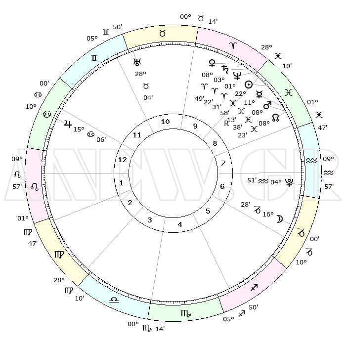 | | ΘΕΣΕΙΣ ΠΛΑΝΗΤΩΝ ΑΣΤΡΟΛΟΓΙΚΟΥ ΧΑΡΤΗ ΤΗΣ ΣΤΙΓΜΗΣ ΑΥΤΗΣ | | | | Πλανήτης | Ζώδιο | Μοίρες | Δεκαήμ. | Σε οίκο | Απόκλιση | | Ακμές των οίκων | | Ηλιος | Ιχθείς | 22°54' | Τρίτο | 9 | 02 S 49 | | 1ος | 22°29' | Καρκίνος | | Σελήνη | Αιγόκερως | 15°44' | Δεύτερο | 6 | 26 S 42 | | 2ος | 13°07' | Λέων | | Ερμής | Ιχθείς | 11°16'R | Δεύτερο | 9 | 04 S 47 | | 3ος | 07°10' | Παρθένος | | Αφροδίτη | Κριός | 08°45' | Πρώτο | 10 | 02 N 28 | | 4ος | 07°09' | Ζυγός | | Αρης | Ιχθείς | 08°35' | Πρώτο | 9 | 09 S 22 | | 5ος | 13°13' | Σκορπιός | | Δίας | Καρκίνος | 15°06' | Δεύτερο | 12 | 22 N 56 | | 6ος | 20°12' | Τοξότης | | Κρόνος | Κριός | 03°21' | Πρώτο | 9 | 00 S 37 | | 7ος | 22°29' | Αιγόκερως | | Ουρανός | Ταύρος | 28°04' | Τρίτο | 11 | 19 N 33 | | 8ος | 13°07' | Υδροχόος | | Ποσειδώνας | Κριός | 01°31' | Πρώτο | 9 | 00 S 36 | | 9ος | 07°10' | Ιχθείς | | Πλούτωνας | Υδροχόος | 04°51' | Πρώτο | 7 | 22 S 50 | | 10ος | 07°09' | Κριός | | Β. Δεσμός | Ιχθείς | 08°23' | Πρώτο | 9 | 08 S 25 | | 11ος | 13°13' | Ταύρος | | Ωροσκόπος | Καρκίνος | 22°29' | Τρίτο | | | 12ος | 20°12' | Δίδυμοι | | Μεσουράνημα | Κριός | 07°09' | Πρώτο | | | |